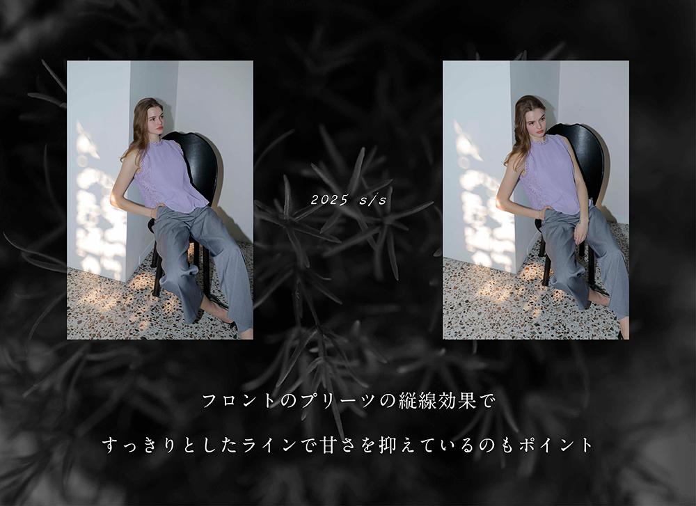 フロントのプリーツの縦線効果で、すっきりとしたラインで甘さを抑えているのもポイント◎