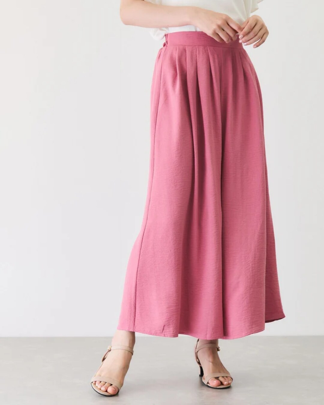 スカート見えするワイドシルエットで、脚やヒップのラインを拾わず体型カバー。