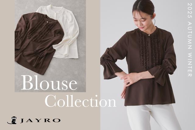 バンドカラー×ギャザーで顔まわりも華やかに演出。