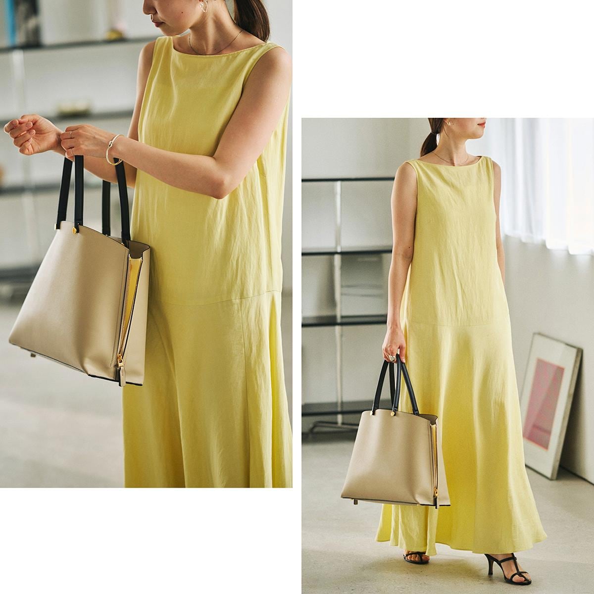 休日に映えるサマーワンピースは、ゆったりとしたスラッシュドネックで程よい抜け感を演出。 ベージュ×オフホワイト(ハンドルはブラック)のバッグが、柔らかな色合いに程よい締め色を添えて大人の品格をプラス。