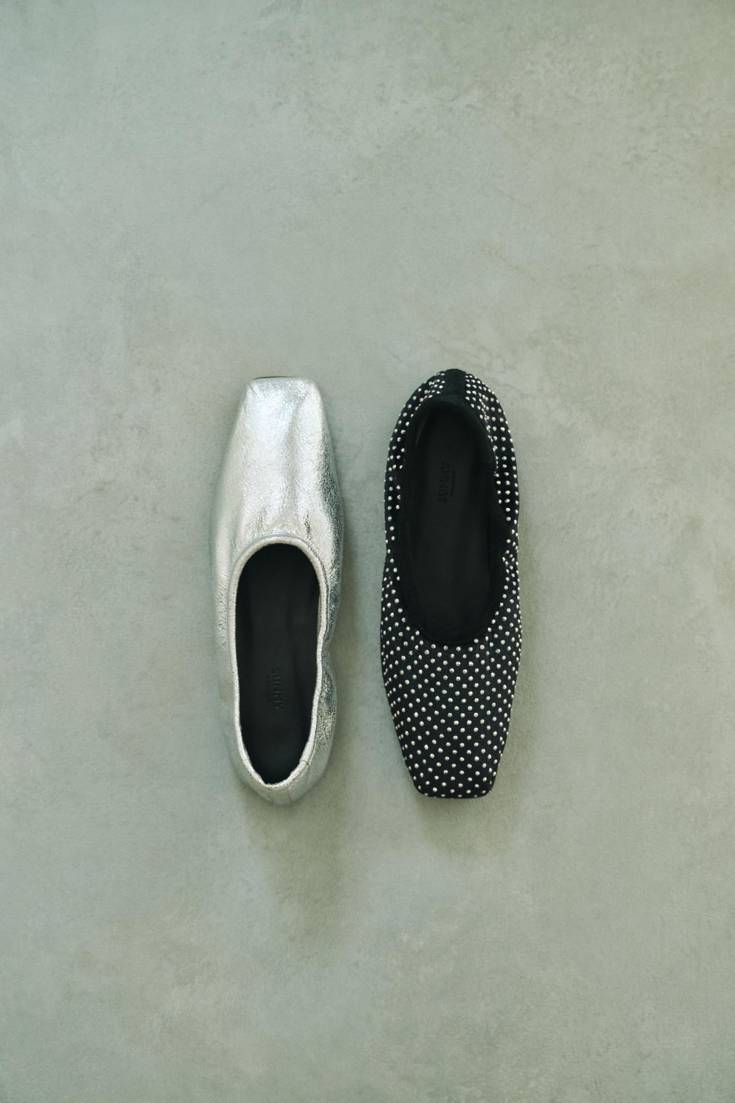METALLICのアクセントが強さとエッジを。ほんのり長めのノーズと計算されたフォルムで指先が当たりにくく柔らかい素材で快適な履き心地のフラットシューズ。
