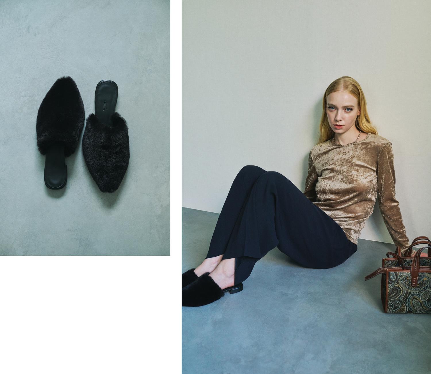 今期はファーとシルバーに注目。暑い時期から軽く履けるスリッパタイプをセレクト。シャープなポインテッドトゥながら、甲とワイズは広めの設計なので靴下を合わせても楽しめそう。