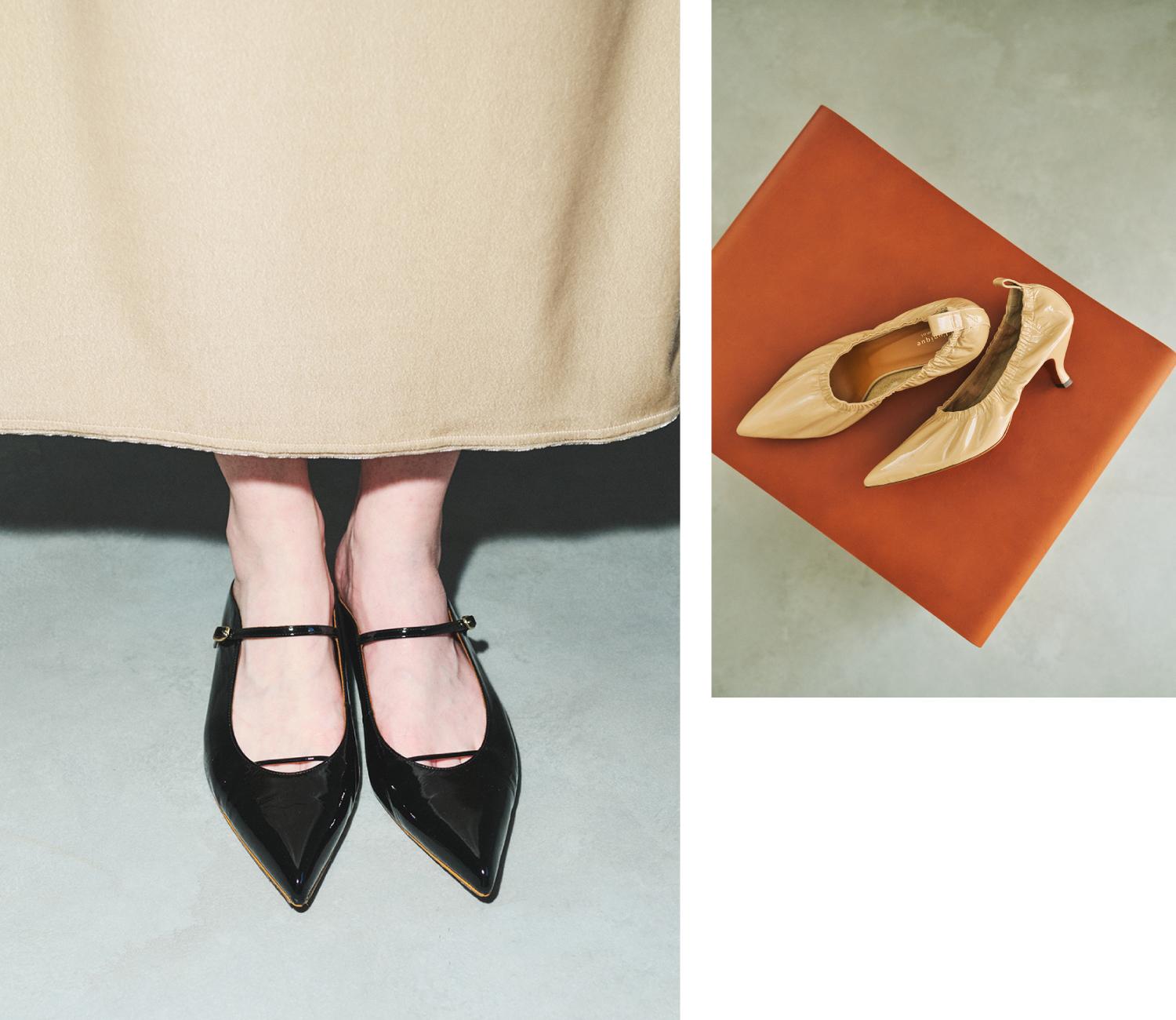 足に沿うようなウェーブラインが美しいミュールと右の定番パンプス。とパンプスは総裏スエードとぐるり施したゴムシャーリングで足当たり抜群のパンプス。