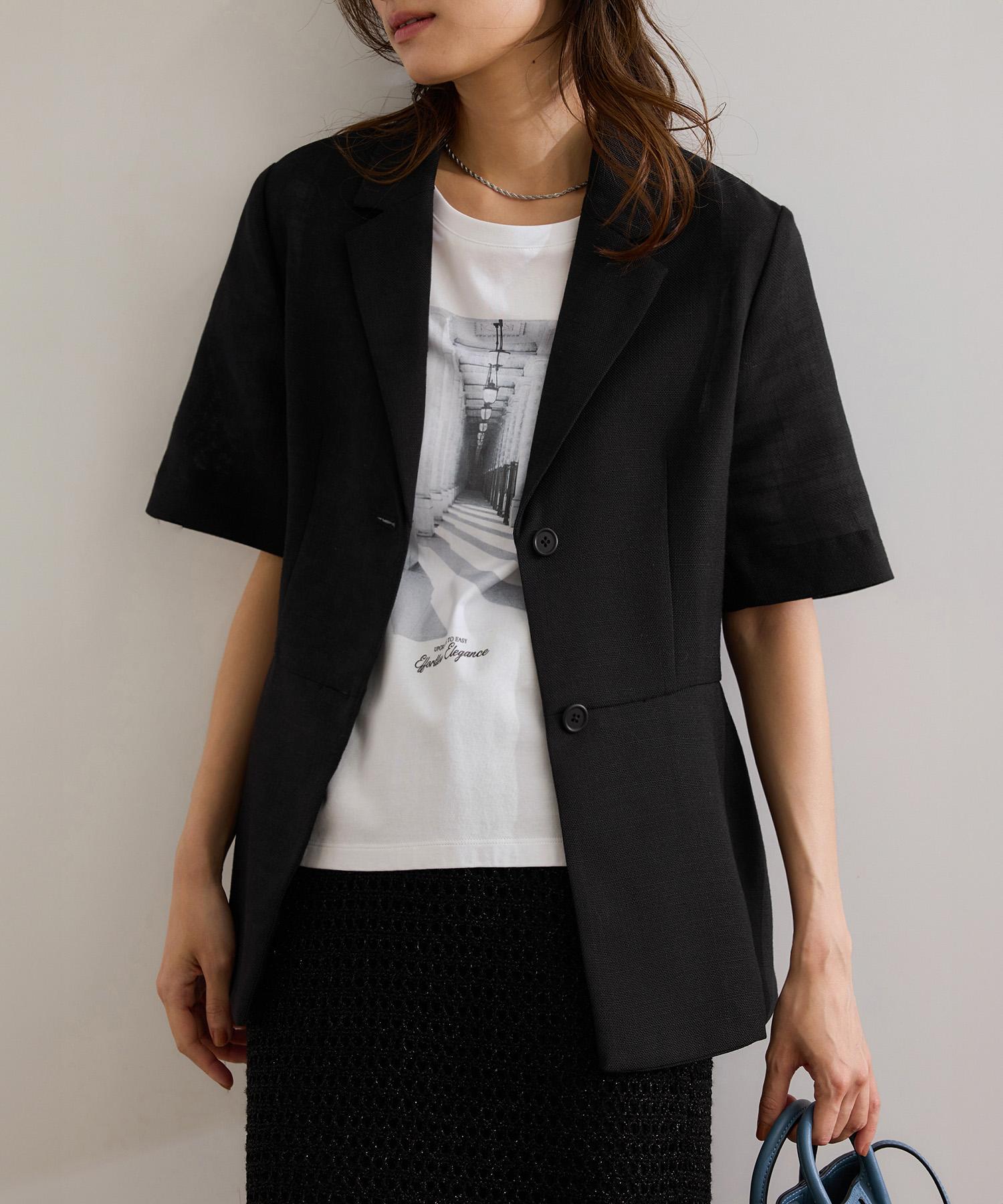 ウエストシェイプや共布ベルトでシルエットを楽しめる、きれいめにもカジュアルにも羽織れる万能な半袖ジャケット。