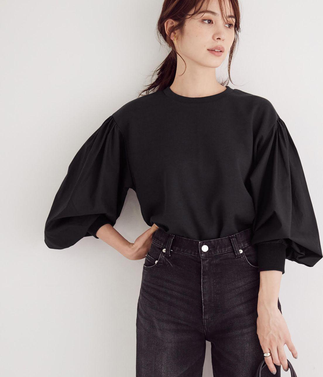 ソフトなタッチで膨らみがある心地よいダンボール素材を使用し、袖には張りのあるブロードをドッキングさせています。素材の膨らみを活かし、立体的なフォルムと変形の袖ボリューム。ミニマルでに甘さ控えめのデザインがポイントです。袖にデザインがあるのでスラックスパンツやタイトスカートなどシックなボトムスと合わせるのがオススメです。