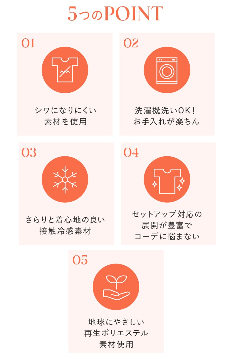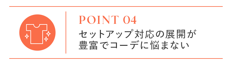 セットアップ対応のアイテム、カラーバリエーションも豊富でコーディネートに悩むことなくおしゃれを楽しめます。