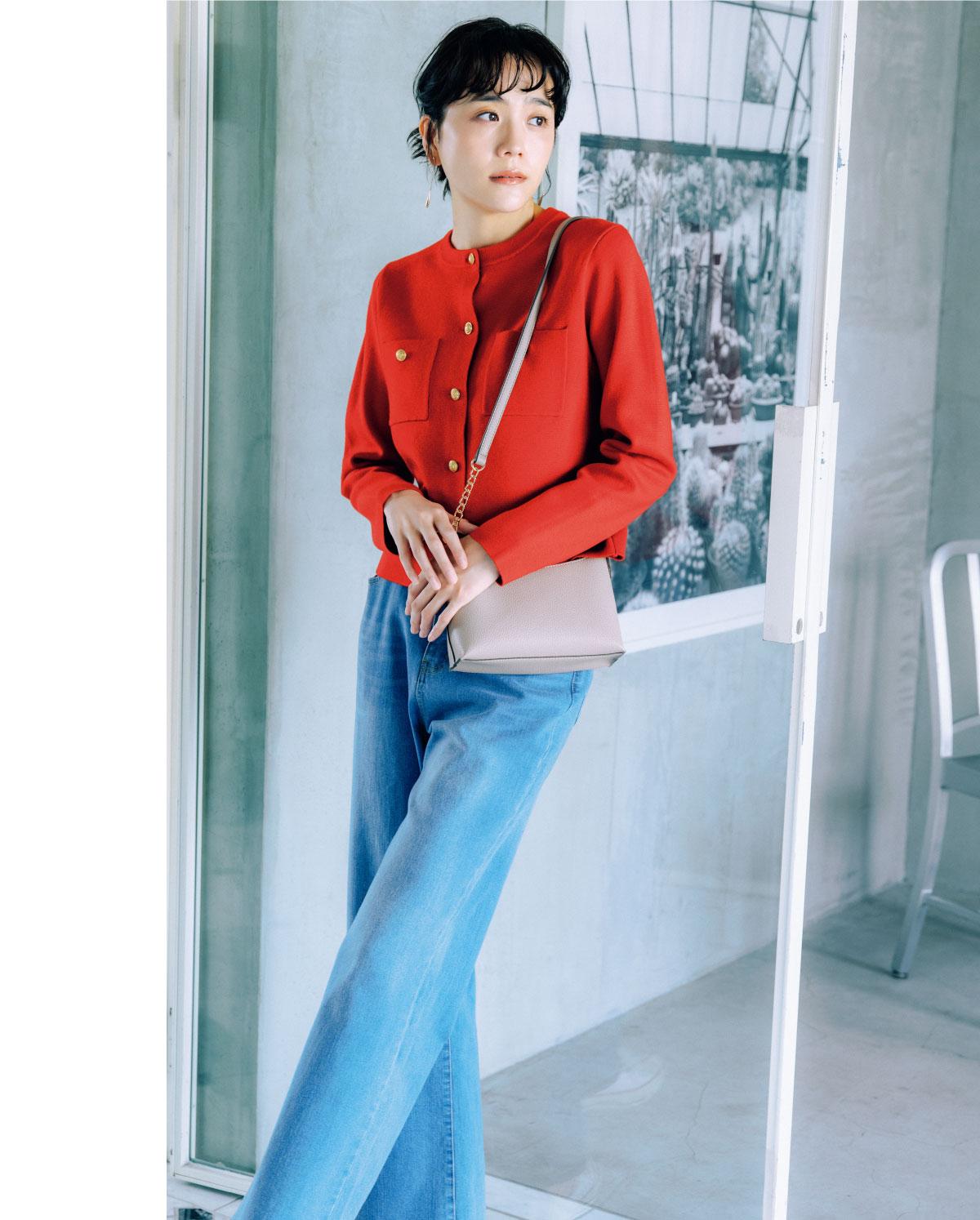 気分の高まる赤の金ボタンカーディガンで、
