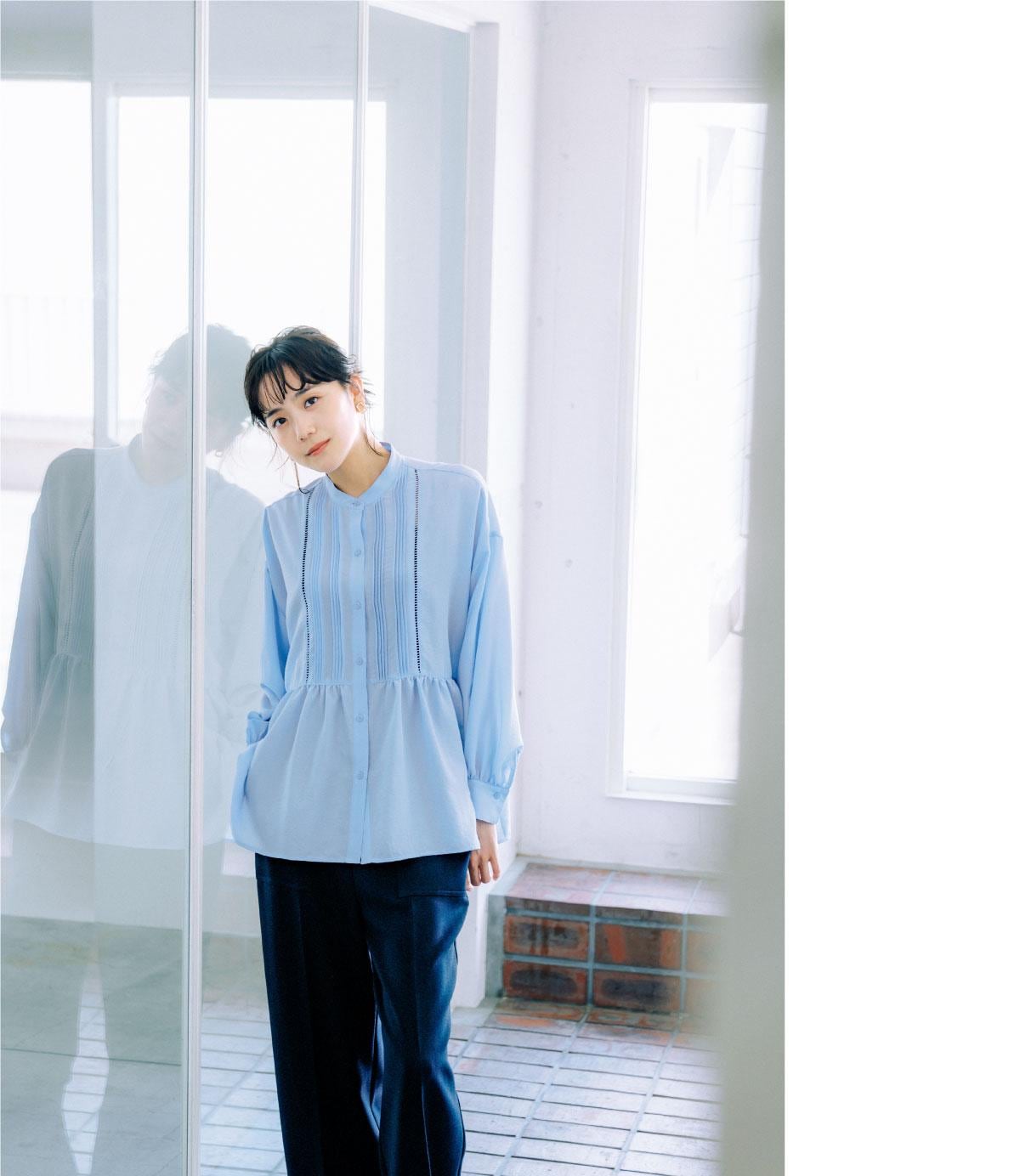 柔らかいブルーカラーで一気に洗練されたコーディネイトに。