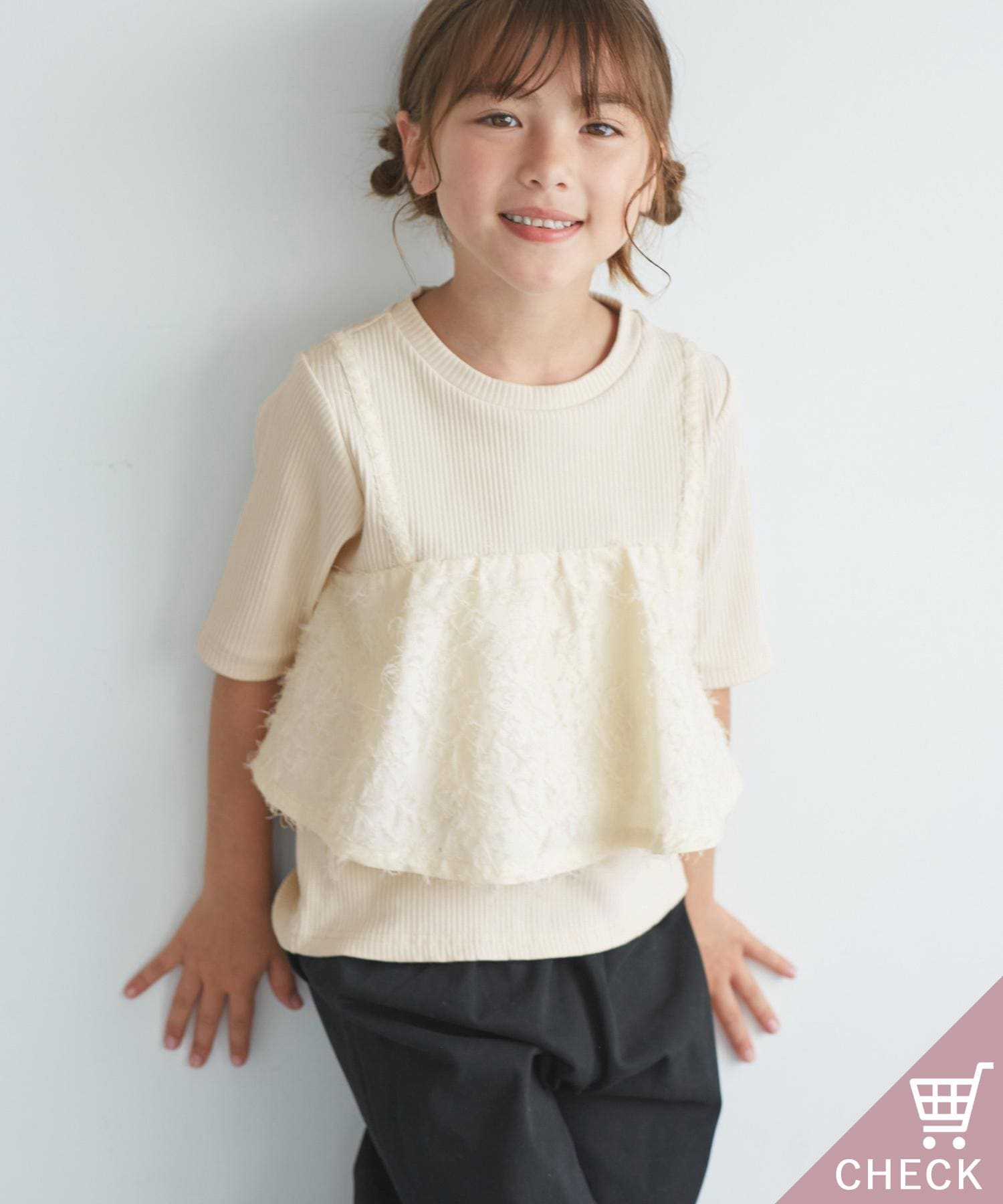 テレコカットソーとフェザー素材のビスチェがドッキングされたデザイン。