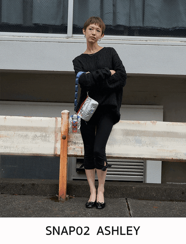 普段から〈Topologie〉を愛用しているというASHLEYさんは2つのサコッシュを併せ使い。スマートフォン用ポケットが付いた「フォンサコッシュ90」をメインに、パファー素材&幅広いベルトがポイントの「パファー リスト ストラップ」を合わせ、さらにカラビナ付きの「ミニ ボトル サコッシュ」をチャーム感覚でドッキング。 新色の「SATELLITE」(バッグ)と「Marine Blue」(ストラップ)のメタリックな質感がコーディネイトに華やかさを添えます。