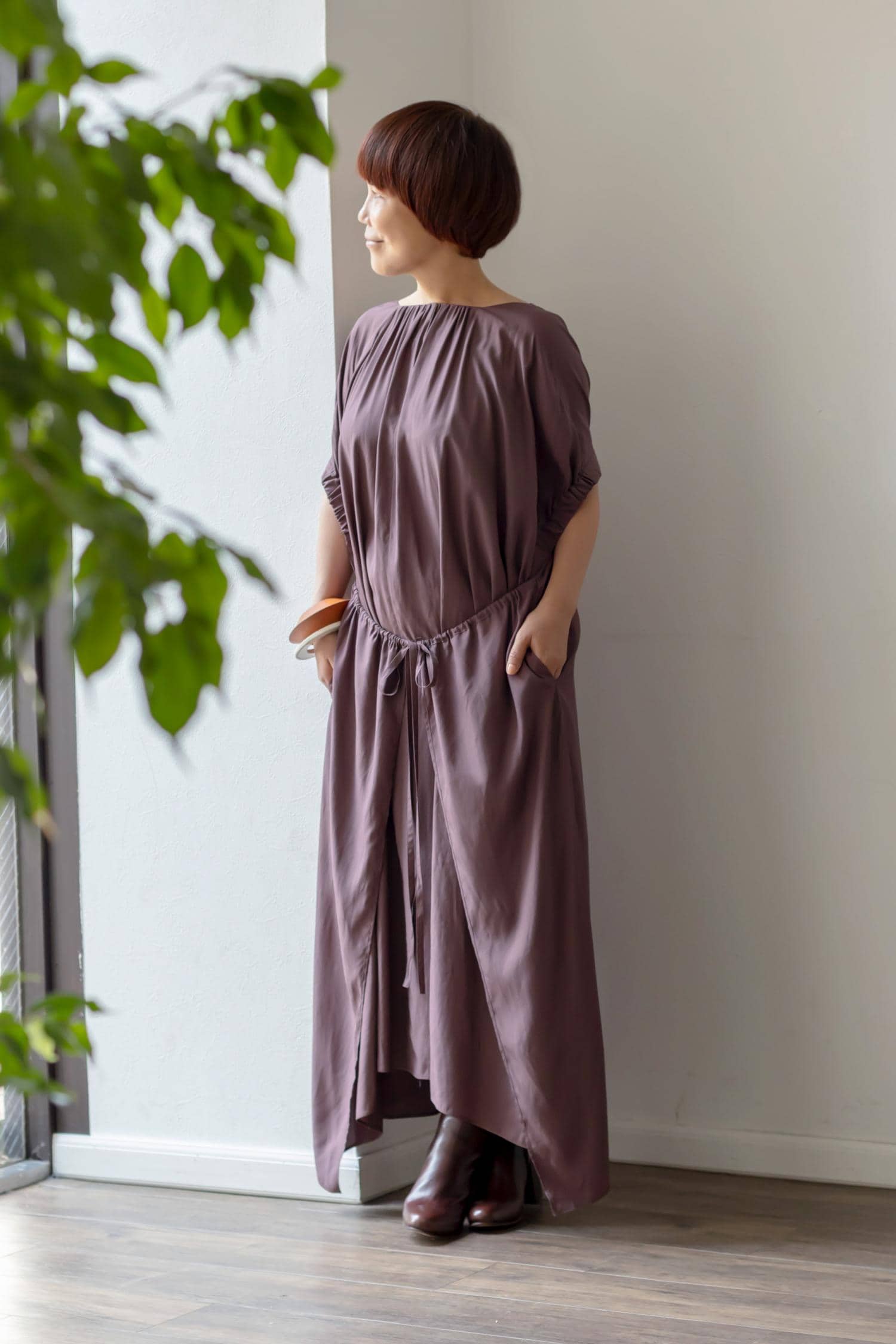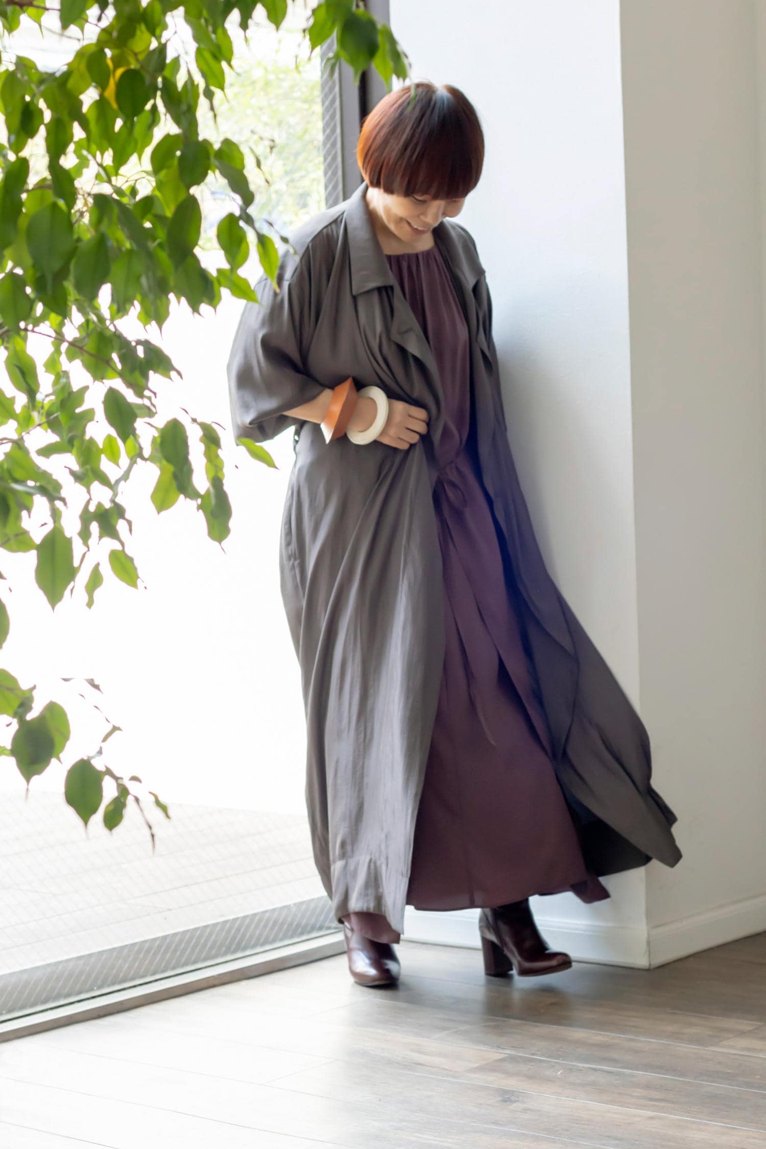 ワンピースの上にガウンコートサラリと羽織ったスタイル。「体のラインが響きやすい薄い素材のアイテムって、大人世代には難しいかなって思っていたけど、重ねることでこんなに豊かな表情になるんですね。発見です!」。時代が変わっていく今だからこそ、新しい価値観を取り入れる心の柔軟さを取り戻したいという山本さん。「ベーシックって、“変わらない”ことではなくて、時代に合わせて常に更新すべきものだと思うんですよね」。