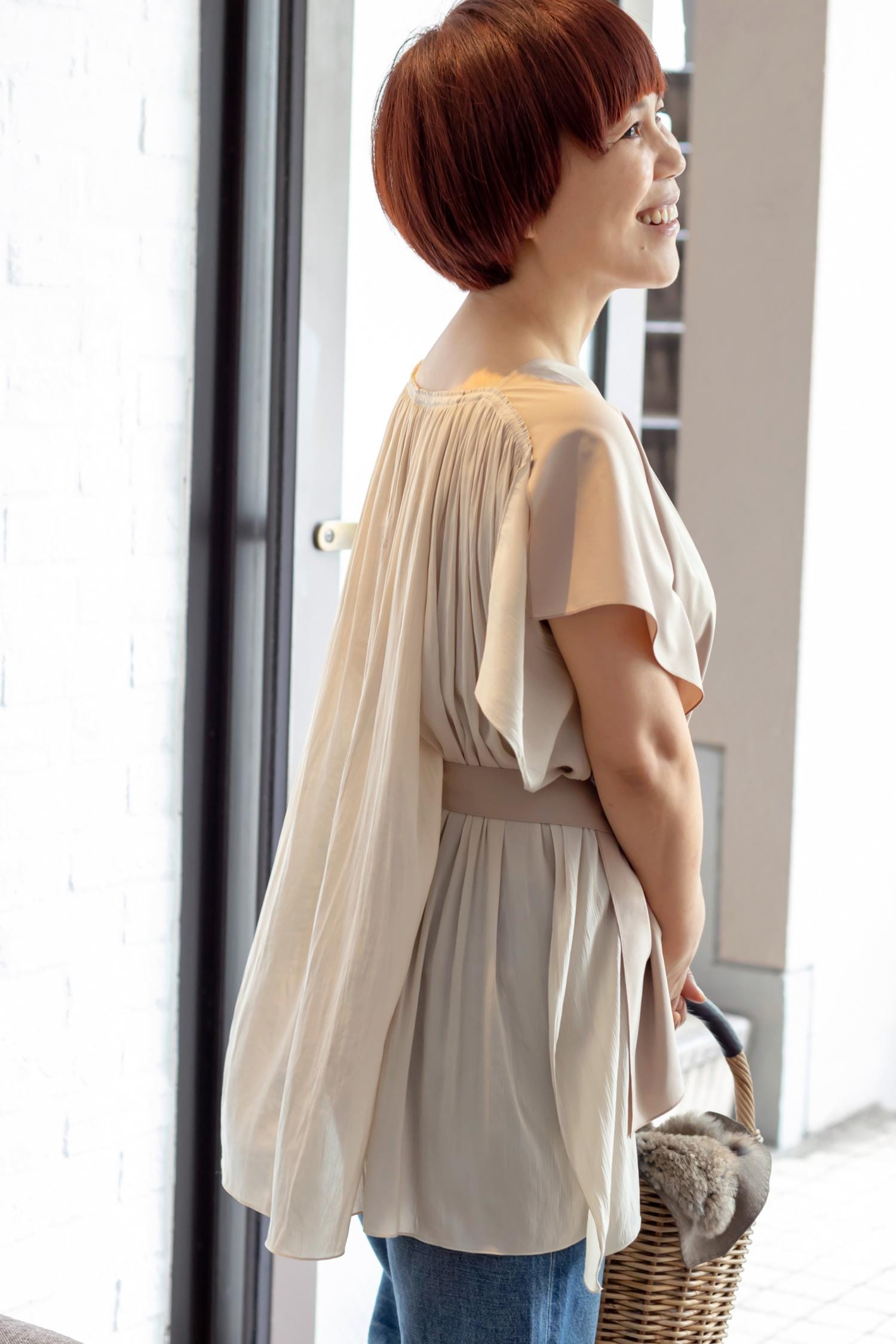 直線裁ちでありながら、素材の変化や、ギャザーづかい、ひもづかいで変化をつけたブラウスにご自身のデニムを合わせて。「体型のエイジングって、首の後ろから背中にかけてのラインに現れがち。背脂がつくんですよね。(笑)このブラウス、それを上手にカバーしてくれる優秀デザイン。着物から発想された平面的なデザインなのに面白い!」。ベージュ系の同系色バイカラーも肌色を生き生きと見せてくれます。