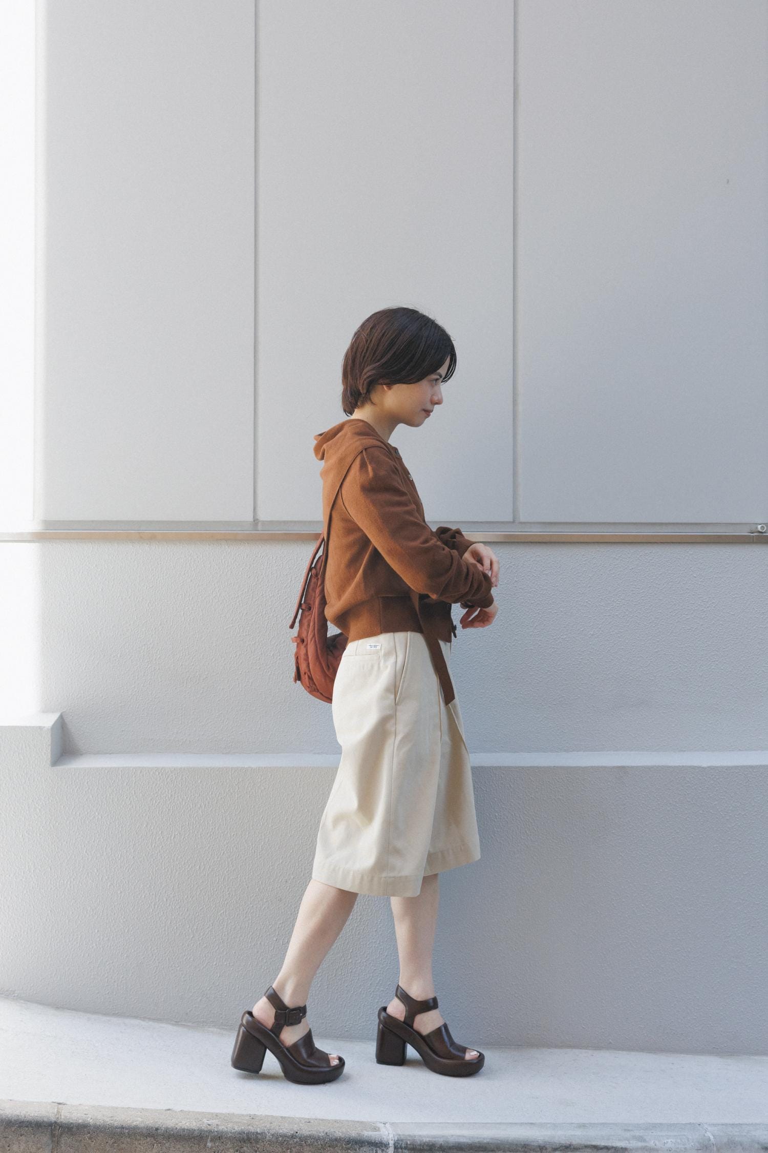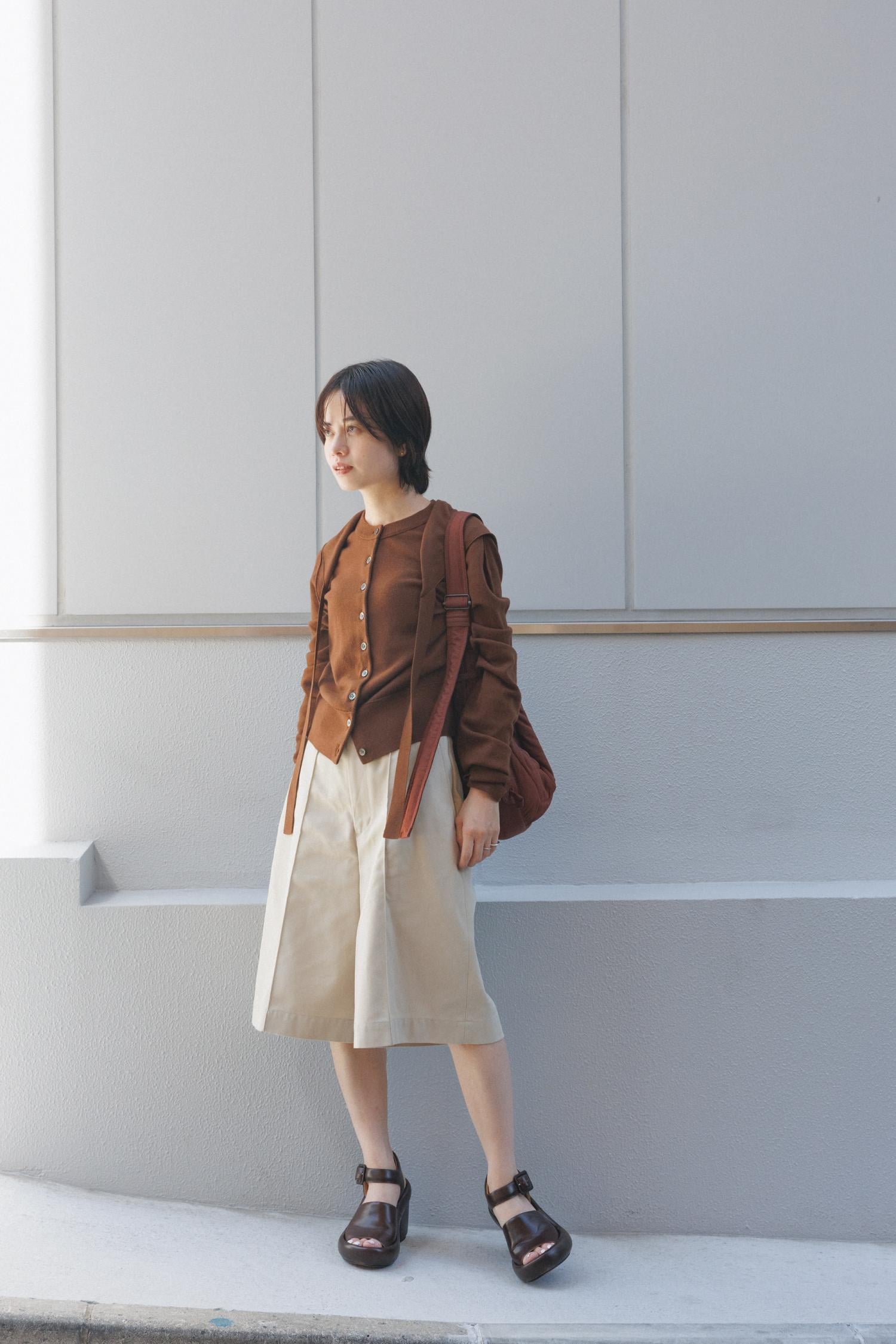バッグとサンダルをブラウンでまとめました。