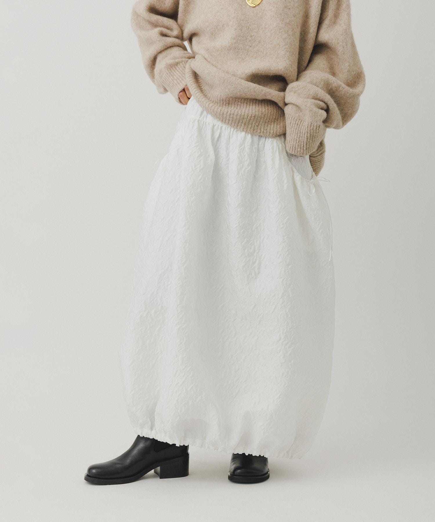 立体感のある華やかなフォルムがデイリーに着映える。ふわっと軽やかに纏え、ジャガード素材が女性らしさを引き立てるロングギャザースカート