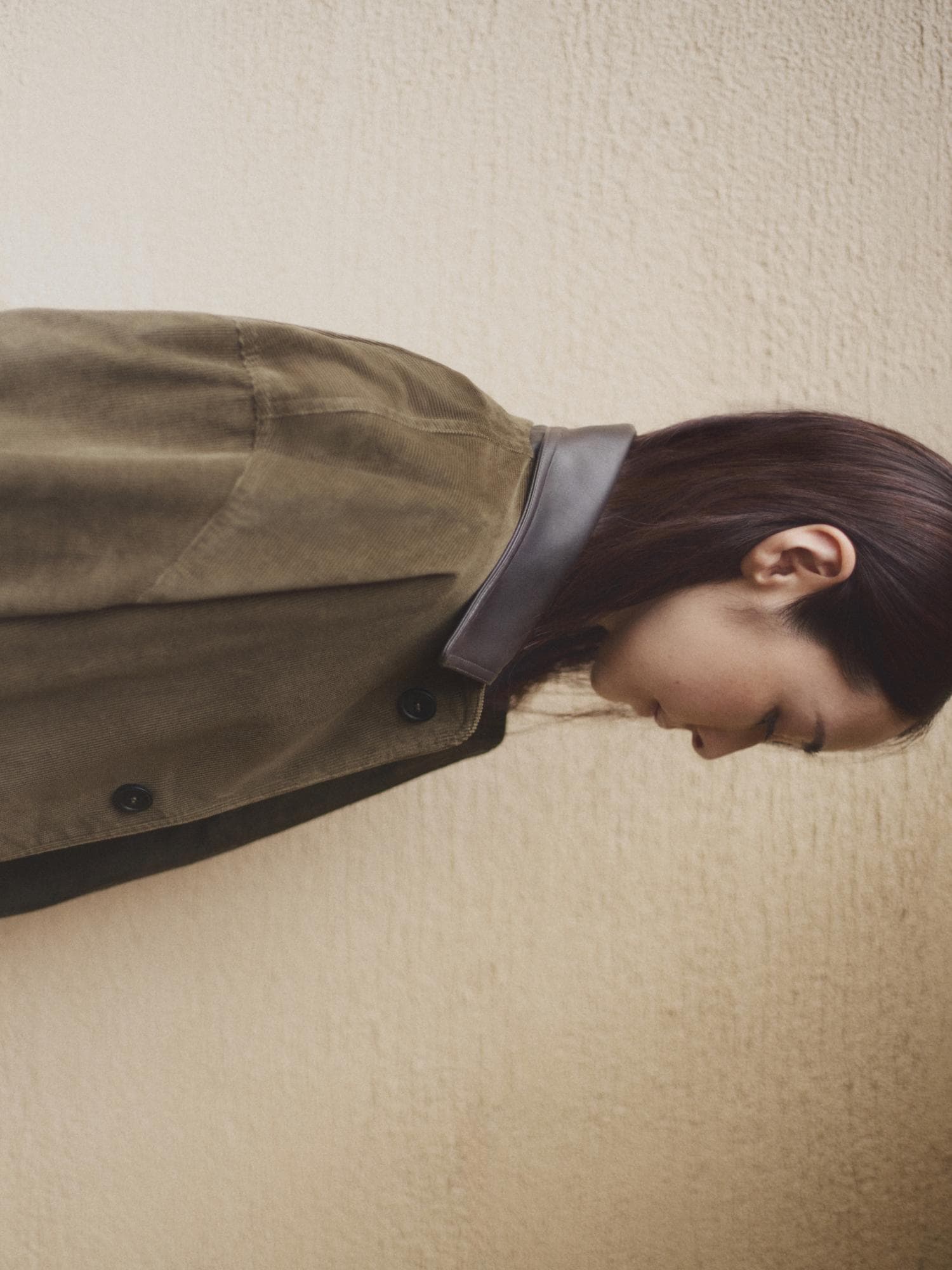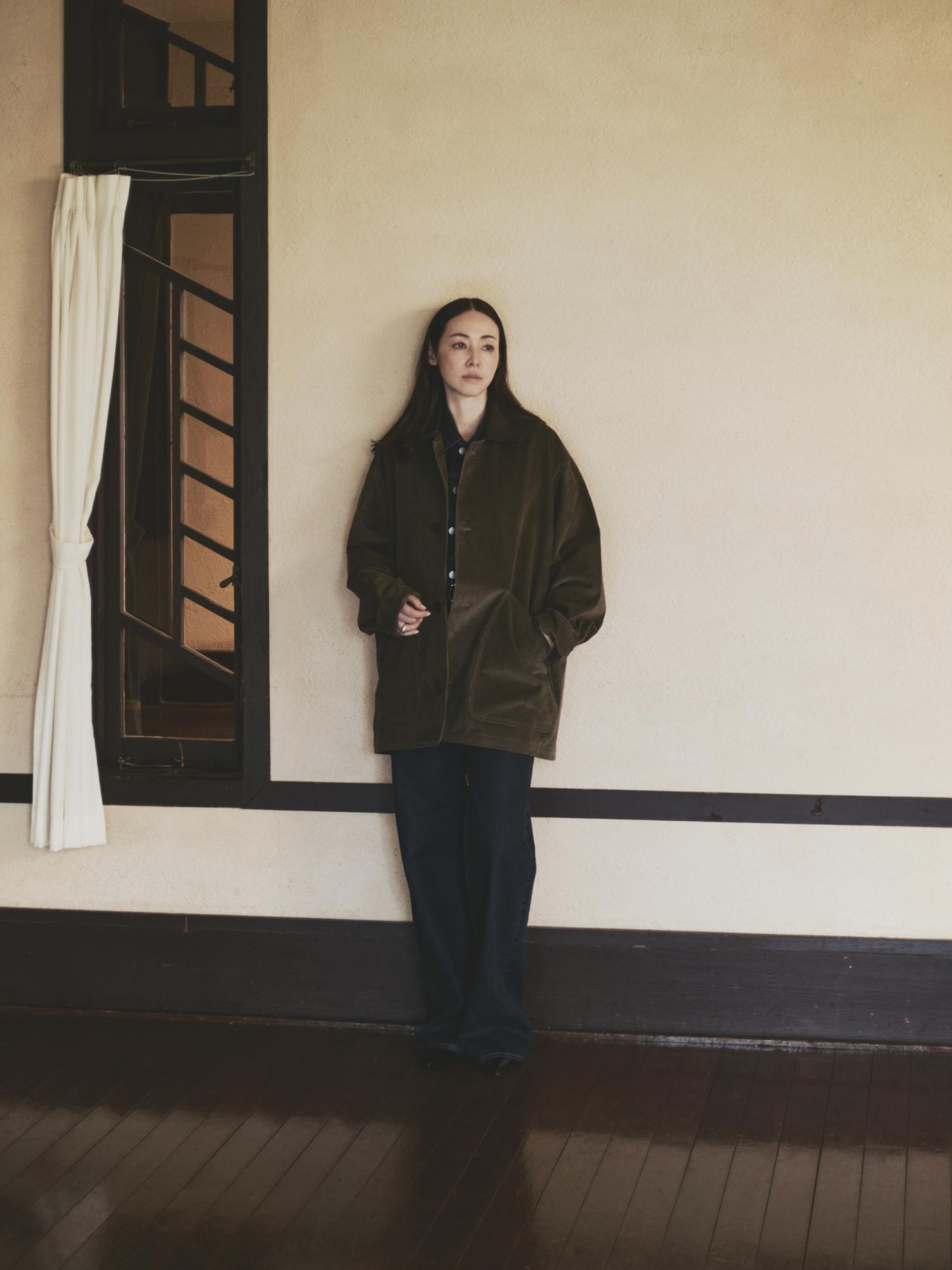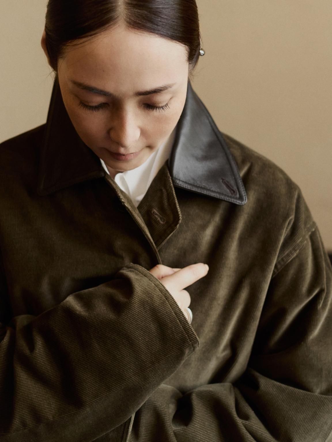 今回の別注アイテムは、Cristaseyaでこれまで発表されてきたブルゾンのシルエットと、襟元に配されたレザーをベースに制作。そこに秋冬らしい深みのあるカーキのコーデュロイのボディと、ボディの色味に合わせて採用したダークブラウンのホースレザーを採用することで、季節感と存在感を兼ね備えた一着に仕上げました。