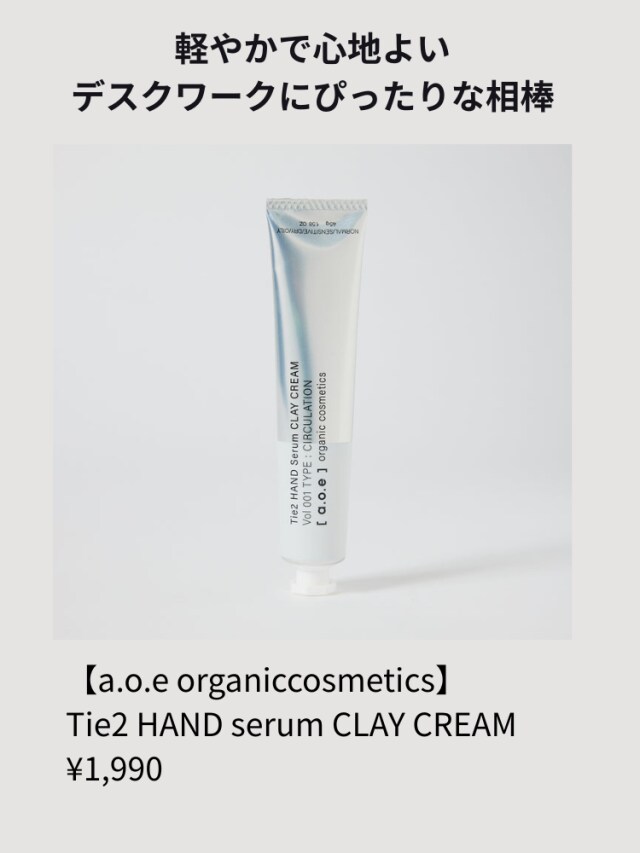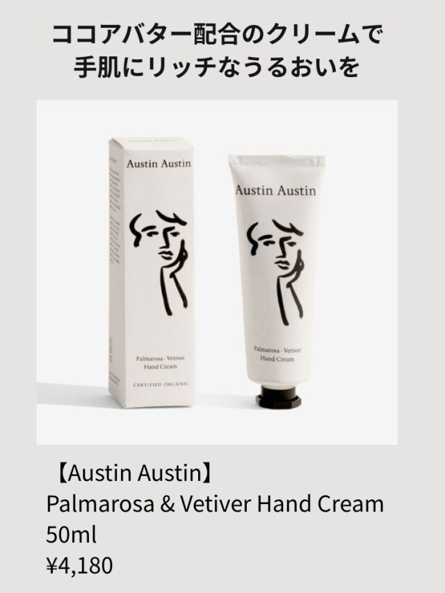 そんな私がこの時期に愛用したいのは、〈Austin Austin〉のハンドクリーム。高い保湿力を持つココアバターを中心に、栄養たっぷりな植物オイルや海藻・藻などの天然成分を配合したこちらは、リッチで濃密なテクスチャーが特徴的。肌のうるおいをしっかりと保護してくれます。