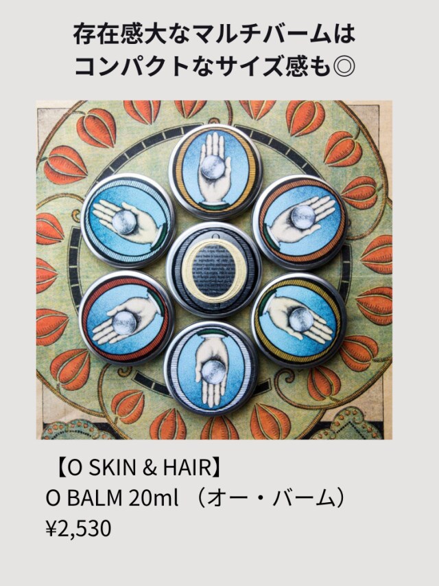 手肌の乾燥が気になる今の季節、マストアイテムとして愛用しているのが〈O SKIN & HAIR〉のマルチバームです。30代後半に入り、肌に触れるものはなるべくナチュラルで安心できる成分を選ぶようになりました。