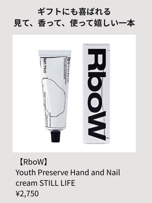 ビタミンA・Eを含むオリーブエキスが配合されており、手肌はもちろん爪までケア可能。ベタつくことなく、まるでうるおいのベールをまとったようにみずみずしい手肌へ導きます。見た目、香り、使い心地。そのすべてを叶えるRboWのハンドクリームなら、美容感度の高いあの人にも、センスにこだわるあの人にも、きっと喜んでもらえるはずです。