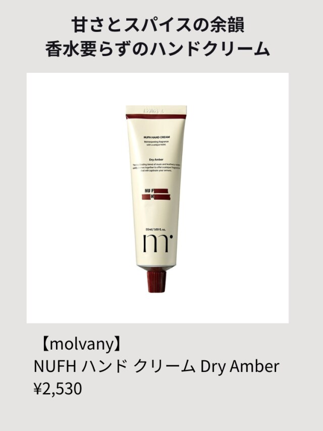 そんな私的に今いちばんヒットしているのが、韓国発ビューティーブランド〈molvany〉から今年発売されたばかりのハンドクリーム。3種の香りのうち、Life&Beauty by JUN ONLINEで先行発売中の「Dry Amber」の香りが特にお気に入りです。
