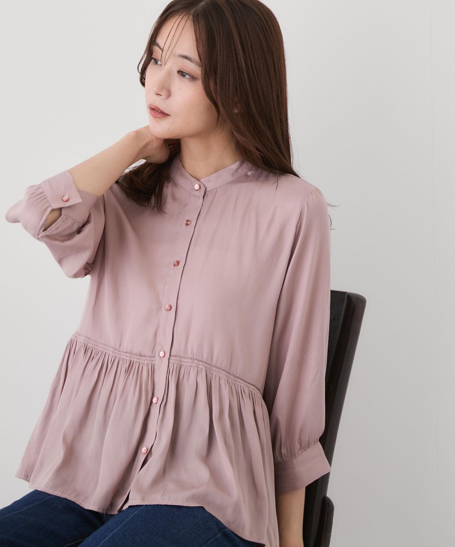 高めのウエスト切り替えとペプラムシルエットで脚長効果とメリハリを演出します。シルクのような光沢と落ち感のあるサテン調素材で、上品な印象を与えます。首元はバンドカラーでスッキリと見え、前後差のヘムラインがこなれた雰囲気に。さまざまなスタイルに合わせやすく、オフィスからカジュアルまで幅広く活躍します。