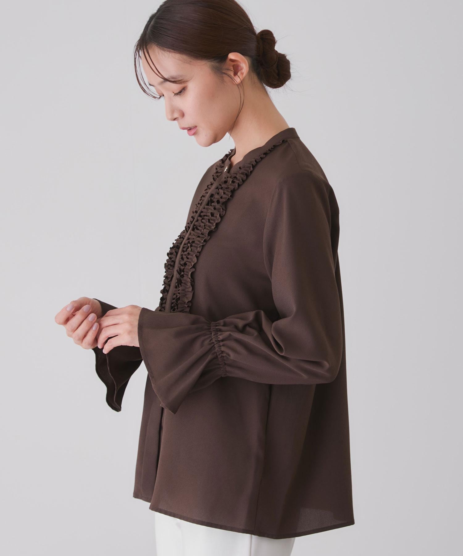 立体的なフリルとギャザー袖が女性らしいデザインのブラウスです。落ち感のある柔らかい素材で、肌ざわりも快適。イン・アウトどちらもバランス良く着こなせ、長く使えるロングシーズンアイテムです。オフィスからカジュアルまで幅広く活躍します。