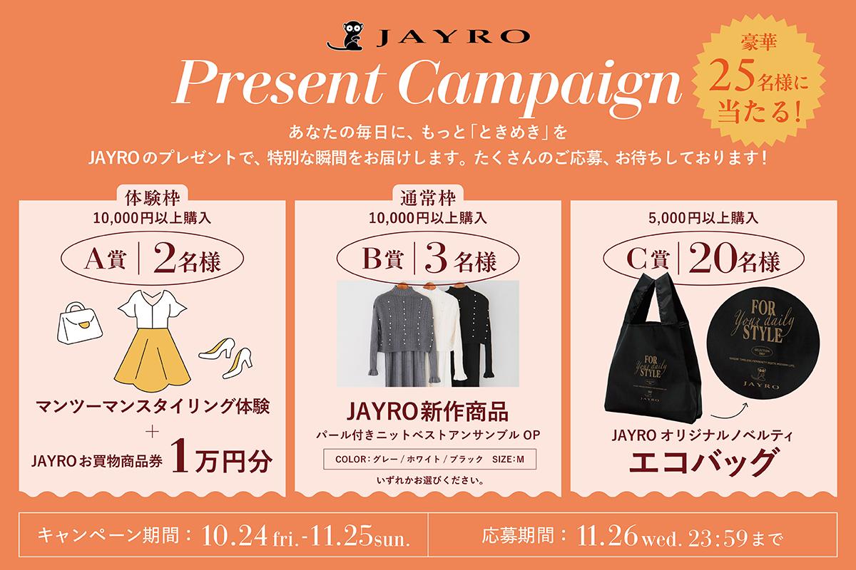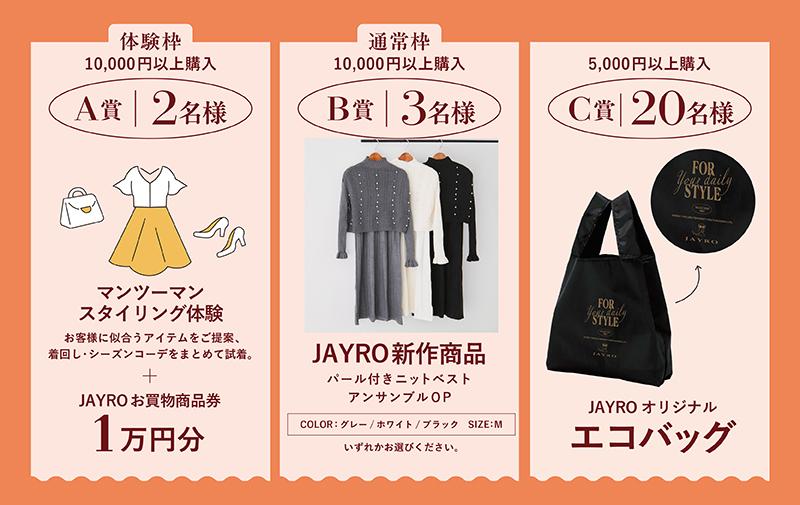 日頃のご愛顧に感謝を込めて、期間中JAYROの商品をご購入いただきご応募いただいた方の中から、抽選で25名さまに「マンツーマンスタイリング体験+JAYROお買物商品券 1万円分」「JAYRO新作商品」「JAYROオリジナルエコバッグ」をプレゼントいたします!