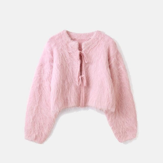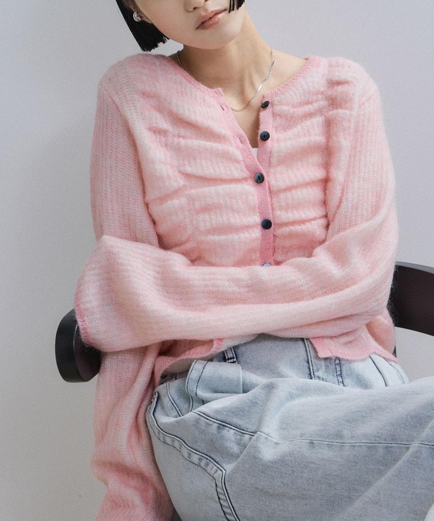 モヘアの柔らかな透け感が女性らしさを引き立てる。軽やかなコンパクトシルエットで、プルオーバーとしても活躍するモヘアカーディガン