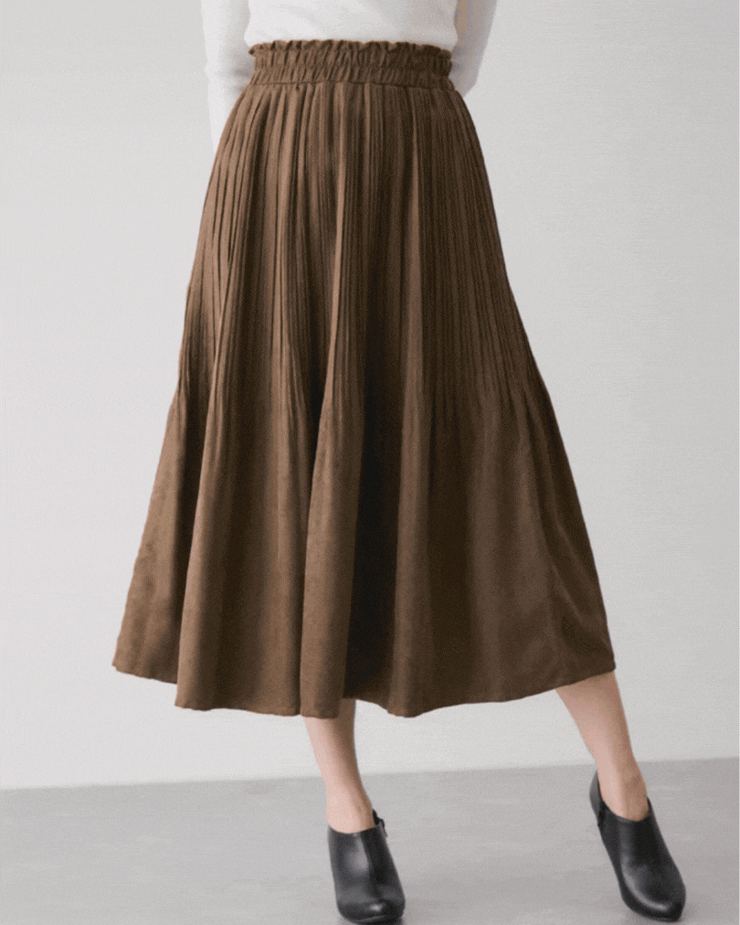 マイクロコール素材の滑らかな肌触りとプリーツデザインが特徴のスカート。