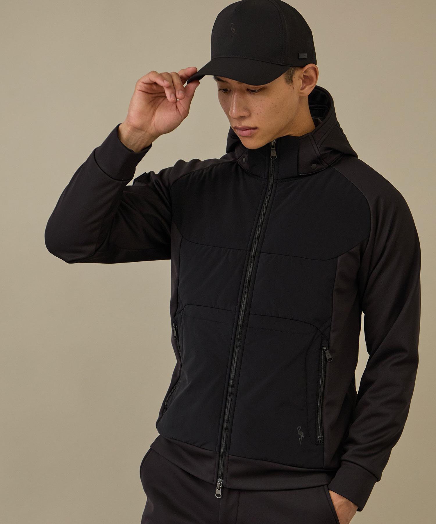 前身頃に薄ダウン、袖と後ろ身頃にはストレッチフリースを組み合わせたハイブリッド設計で、