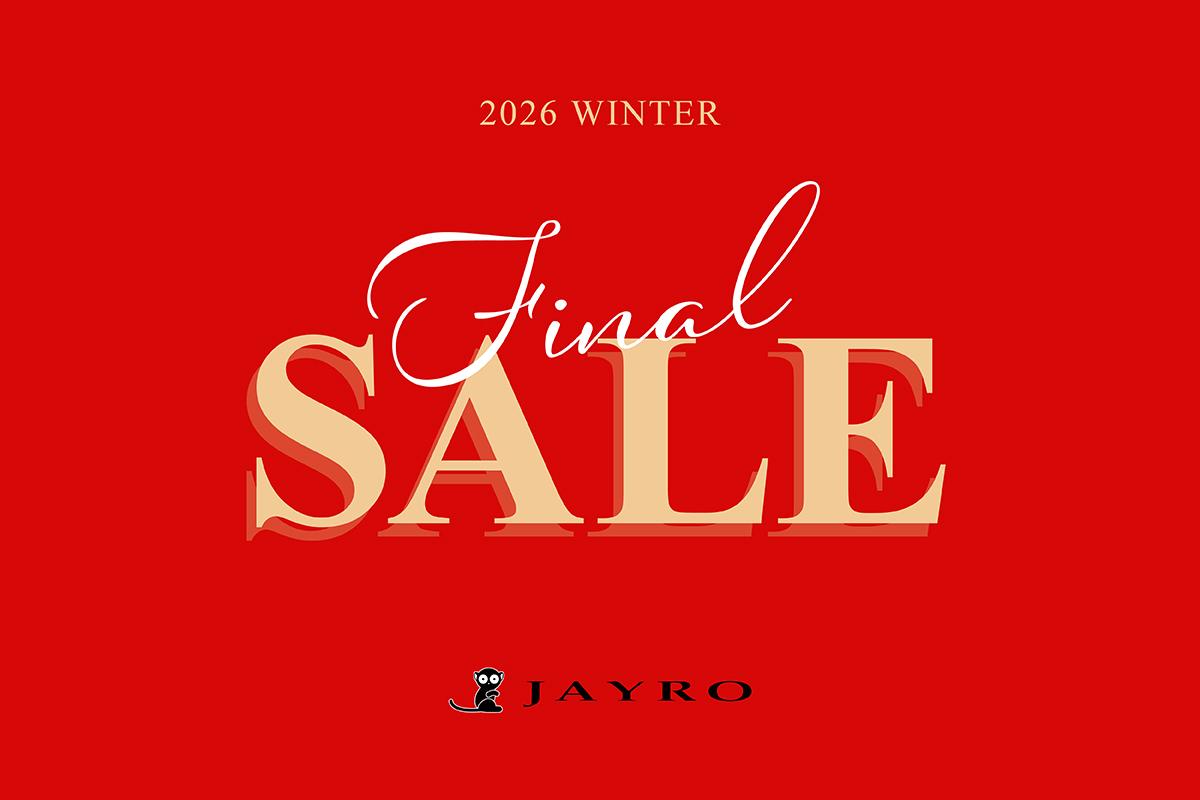FINAL SALE | JAYRO 2026.01.27 FINAL SALEを開催!!今季新作の人気アイテムがプライスダウン! 残り僅かなアイテムも多数。ぜひ、この機会をお見逃しなく! 30%OFF JAYRO 裏起毛HAKIYASE+ ¥4,543(税込) 30%OFF JAYRO エポレットショルダーワイドハイネックプルオーバー ¥3,773(税込) 30%OFF JAYRO ハイネックニット ¥3,773(税込) 30%OFF JAYRO ポイントパール付きニットプルオーバー ¥3,773(税込) 30%OFF JAYRO ハイネックスリット入りニットプルオーバー ¥3,773(税込) 30%OFF JAYRO マイクロコールフレアパンツ ¥3,773(税込) 30%OFF JAYRO マイクロコールイージーパンツ ¥3,773(税込) 30%OFF JAYRO エポレットワイドハイネックプルオーバー ¥3,773(税込) 30%OFF JAYRO チュールレイヤードリブニット ¥3,773(税込) 30%OFF JAYRO 裏起毛タック入りスカンツ ¥3,773(税込) 30%OFF JAYRO パール付きニットカーディガン ¥3,773(税込) 30%OFF JAYRO カットツイル裏起毛ワイドパンツ ¥3,773(税込) 30%OFF JAYRO キーネック裏シャギートップス ¥3,003(税込) 30%OFF JAYRO ニットビーバーコート ¥13,090(税込) 30%OFF JAYRO ヘンリーネックロンT ¥3,465(税込) 30%OFF JAYRO ツイードドッキングプルオーバー ¥3,773(税込) 30%OFF JAYRO マチ入りマーメイドスカート ¥3,773(税込) NEW! 30%OFF JAYRO フロッキープリントパンツ ¥4,543(税込) 30%OFF JAYRO ヒートハイネックニットプルオーバー ¥4,543(税込) 30%OFF JAYRO パネルプリントニットスカート ¥4,543(税込) 30%OFF JAYRO リブ切替ハイネックニット ¥4,543(税込) 30%OFF JAYRO 袖ファー付きショートコート ¥7,315(税込) 30%OFF JAYRO スエードエコファー付きライダースジャケット ¥6,083(税込) 30%OFF JAYRO カシミヤライクボリュームスリーブプルオーバー ¥5,313(税込) 30%OFF JAYRO ヤクタッチ畦編みVプルオーバー ¥4,543(税込) 30%OFF JAYRO シャギーダイヤ柄ニットプルオーバー ¥4,158(税込) 30%OFF JAYRO ヤクライクVネックニットプルオーバー ¥4,158(税込) 30%OFF JAYRO エコファー襟付きロングコート ¥9,240(税込) 30%OFF JAYRO ヤクタッチワイドスリーブニットジャケット ¥5,313(税込) 30%OFF JAYRO 2WAYウエストタックシャツワンピース ¥4,543(税込) 30%OFF JAYRO 起毛加工シャギーカーディガン ¥5,005(税込) 30%OFF JAYRO フェイクウールスタンドジャケット ¥6,083(税込) 30%OFF JAYRO ラメシャギー配色ニット ¥4,851(税込) 30%OFF JAYRO ループツィードショートコート ¥7,546(税込) 30%OFF JAYRO 裏毛タックガウチョパンツ ¥3,773(税込) 30%OFF JAYRO マフラー付きラメドルマンニット ¥6,083(税込) 30%OFF JAYRO 箔コーティングVネックプルオーバー ¥6,083(税込) 30%OFF JAYRO パールネックニット ¥4,543(税込) 30%OFF JAYRO Vネックニットプルオーバー ¥4,543(税込) 30%OFF JAYRO チュールフリル重ねニットプルオーバー ¥4,543(税込) 30%OFF JAYRO テーラー衿ショートPコート ¥9,240(税込) 30%OFF JAYRO ジャガードチェックカーディガン ¥3,465(税込) 30%OFF JAYRO コーデュロイ中綿ブルゾン ¥6,083(税込) 30%OFF JAYRO 中綿キルトフードコート ¥6,083(税込) 30%OFF JAYRO パールスリーブドルマンニット ¥3,773(税込) 30%OFF JAYRO ドット柄カーディガン ¥4,543(税込) 30%OFF JAYRO もち軽配色ニットチュニック ¥4,543(税込) 30%OFF JAYRO マルチカラーストライプニットスカート ¥4,543(税込) 30%OFF JAYRO ボートネックニット ¥3,773(税込) 30%OFF JAYRO フェミニンツィード調ニットカーディガン ¥4,543(税込) 30%OFF JAYRO 中綿モンスターコート ¥5,313(税込) 30%OFF JAYRO デニムドッキングノーカラーブルゾン ¥6,083(税込) 30%OFF JAYRO ラメMIXヤーン畔編みニットプルオーバー ¥4,158(税込) 30%OFF JAYRO プードルファースタンドショートジャケット ¥5,313(税込) 30%OFF JAYRO チェック柄ニットスカート ¥4,543(税込) 30%OFF JAYRO ボリュームスリーブチュニック ¥4,543(税込) 30%OFF JAYRO 裏シャギーナロースカート ¥3,773(税込) 30%OFF JAYRO 中綿ブルゾン ¥12,320(税込) 30%OFF JAYRO ナンバーロゴプルオーバー ¥3,773(税込) 30%OFF JAYRO バイカラープリーツスカート ¥6,545(税込) すべてのセールアイテムはこちら ▲TOPに戻る▲ Autumn/Winter Lookbook vol.7 | JAYRO 柔らかな光をまとったような、軽やかで女性らしいショートコート。 フードの立ち上がりや袖口のディテールが品の良さを添え、オンオフ問わず活躍します。 優しいカラーが表情まで明るく見せてくれる一枚。 WINTER SALE | JAYRO WINTER SALEを開催!!今季新作の人気アイテムがプライスダウン! まとめ買いのチャンスです♪ぜひ、この機会をお見逃しなく。 Autumn/Winter Lookbook vol.6 | JAYRO 静けさの中に、芯のある美しさを。上品に映えるリブハイネックニット。 縦のラインを美しく強調する、繊細なリブ編み。 ほどよく首元を包むハイネックが、顔まわりをすっきりと上品に演出します。 OUTER COLLECTION | JAYRO 寒さが本格的に訪れるこの季節、JAYROでは多彩なアウターをご紹介。 冬のコーディネートに欠かせないシンプルなコートから暖かさ抜群のダウンまで、幅広いスタイルと機能性を兼ね備えたアイテムが揃っています。 Autumn/Winter Lookbook vol.5 | JAYRO ビッグボタンで魅せる、大人のバルーンカーディガン。 ふんわり袖が今っぽい。大きめボタンがアクセントの バルーンスリーブカーディガン さりげ