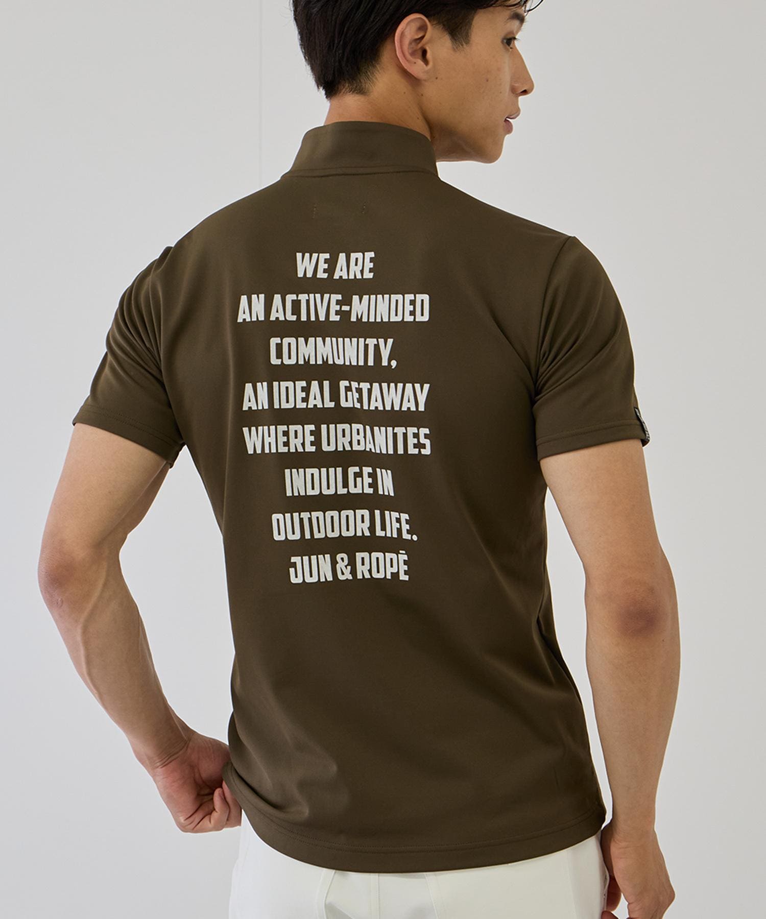 バックプリントが目を引く、ハーフジップシャツ