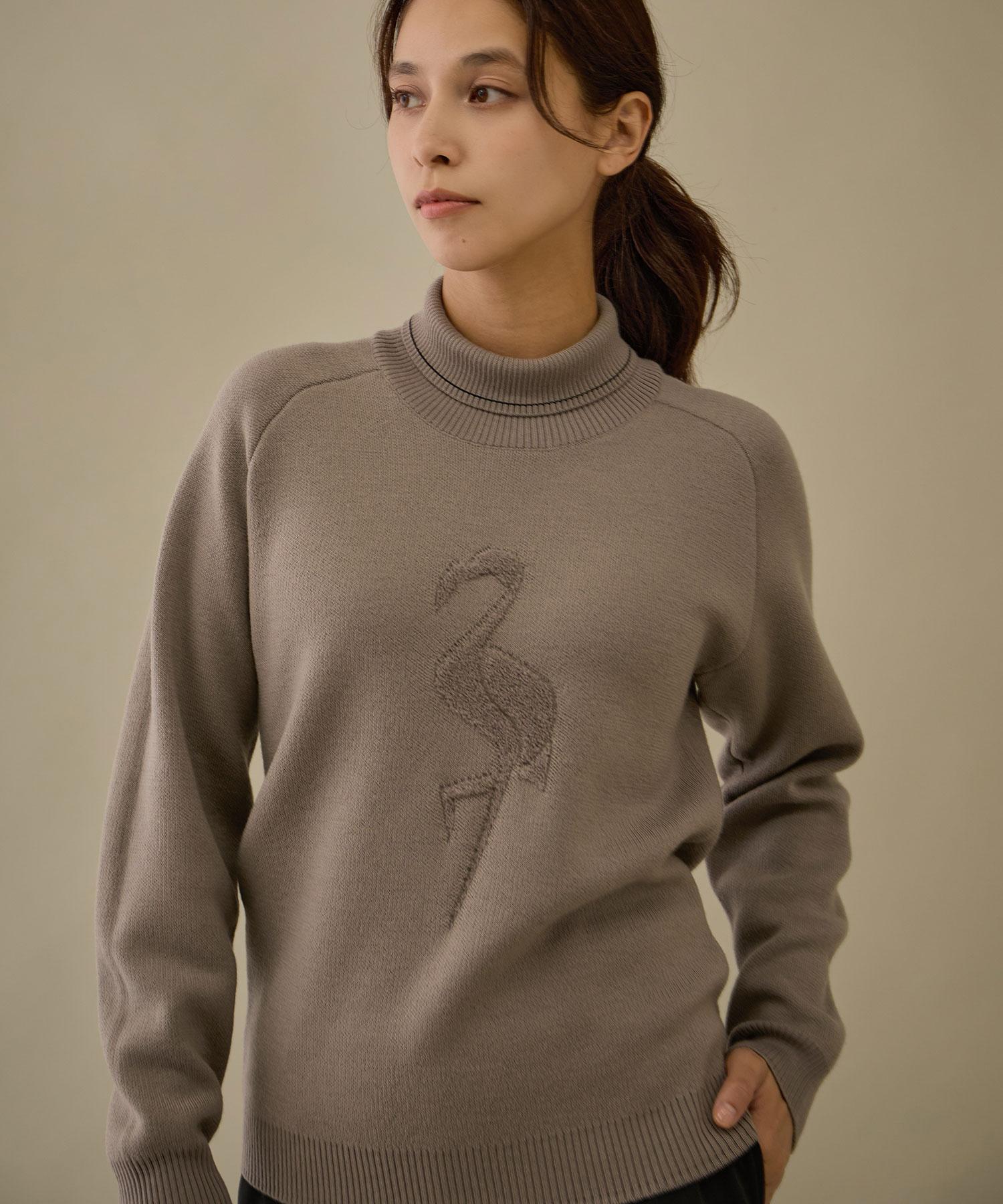 フロントの大胆な配置のフラミンゴモチーフは、ブークレ組織と編地変化の表現で
