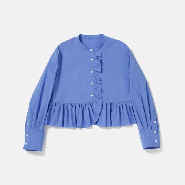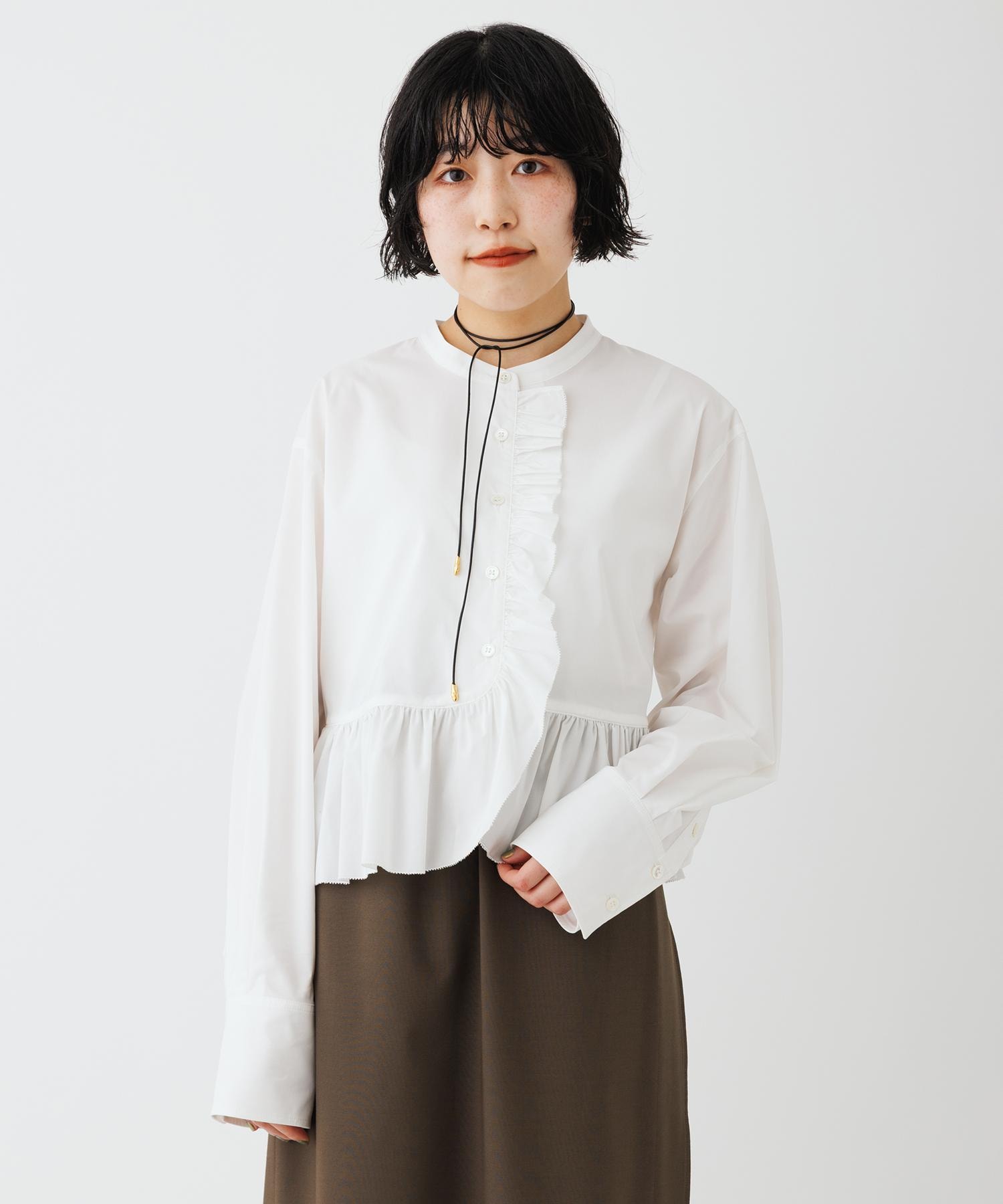 《オケージョン対応》立体的なギャザーデザインが甘すぎず大人フェミニンなムードに。すっきりとしたバンドカラーがこなれ感を演出してくれるフリルブラウス