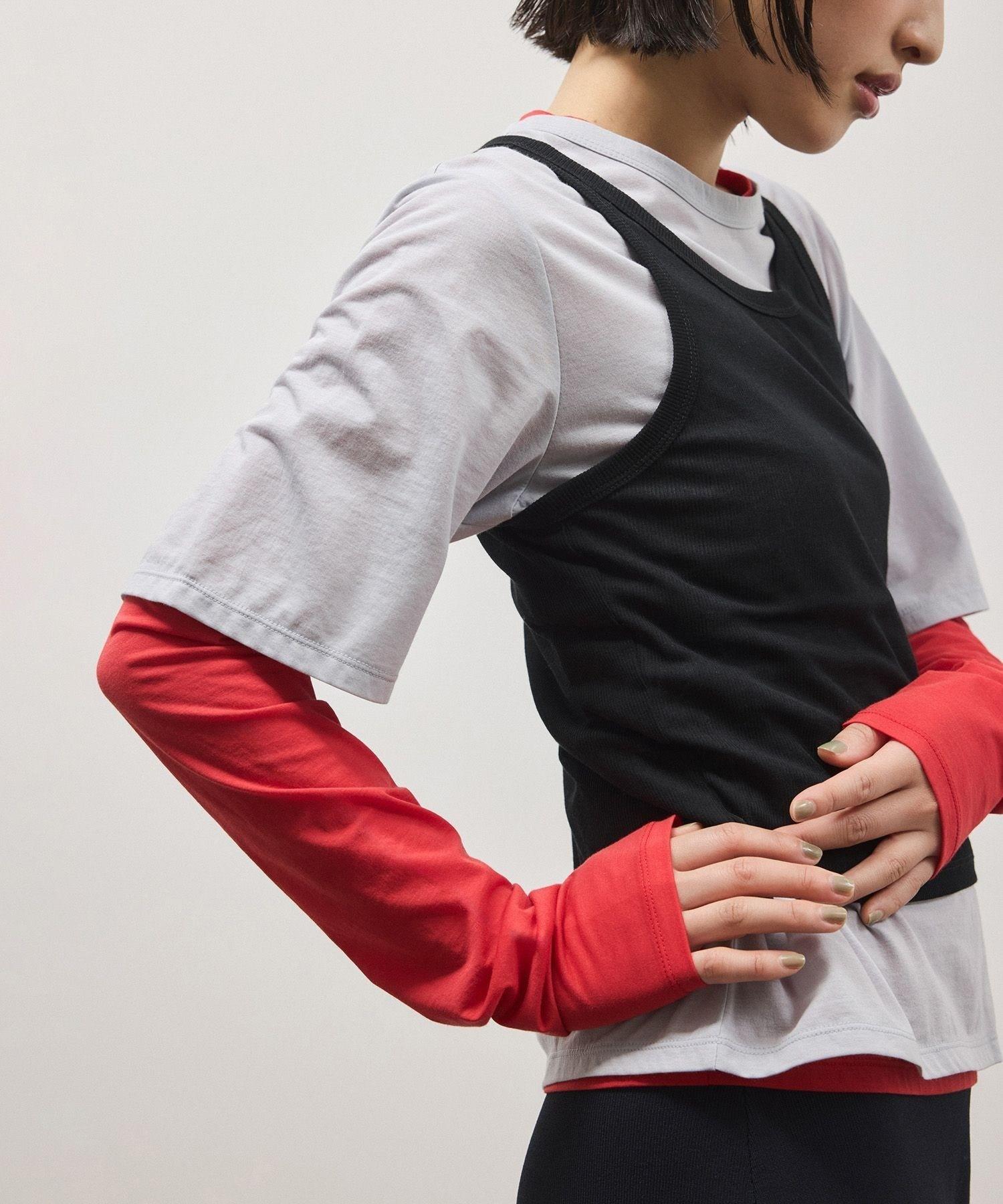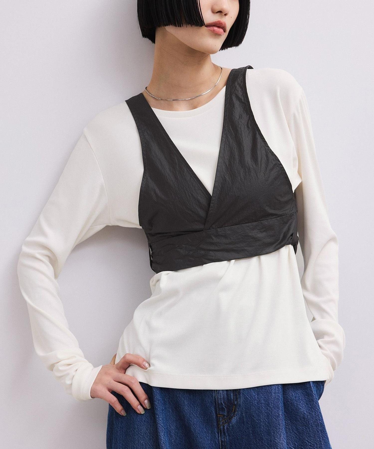 旬なレイヤードスタイルを楽しめる1着。こなれ感のあるカラー使いが目を惹く、それぞれ単品使いでも着回せる3レイヤードジャージートップス