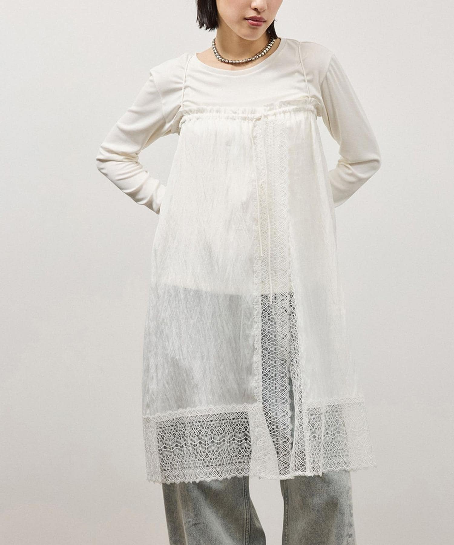 ワンピースにもスカートにも変化する一着。繊細なレースのディティールが、普段のスタイリングにプラスワンするだけで華やかさをプラスしてくれるアイテム