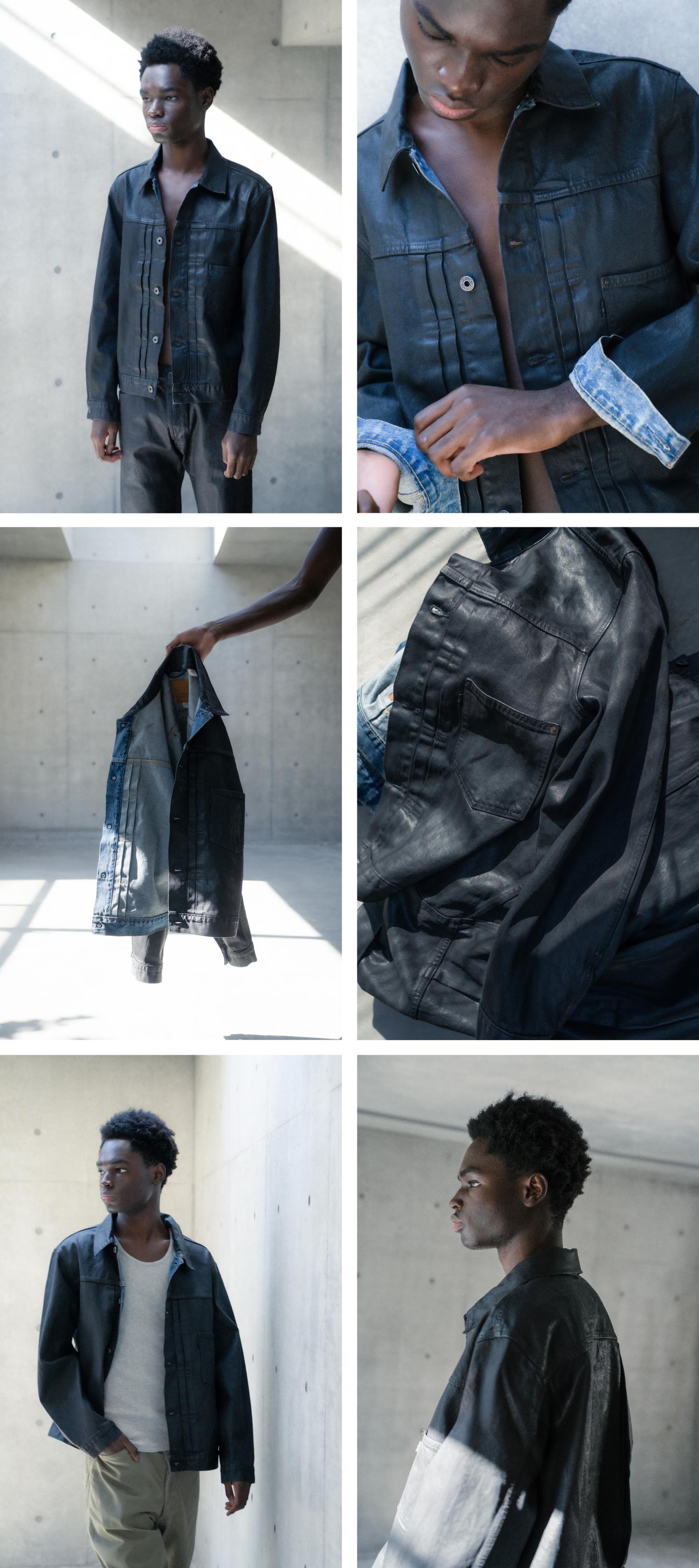 デニムのベースカラーにはウォッシュをかけたヴィンテージ風のライトインディゴカラーにし、その上にブラックのPUコーティングを施すことで、伝統的かつ前衛的でコンテンポラリーな風合いを表現。