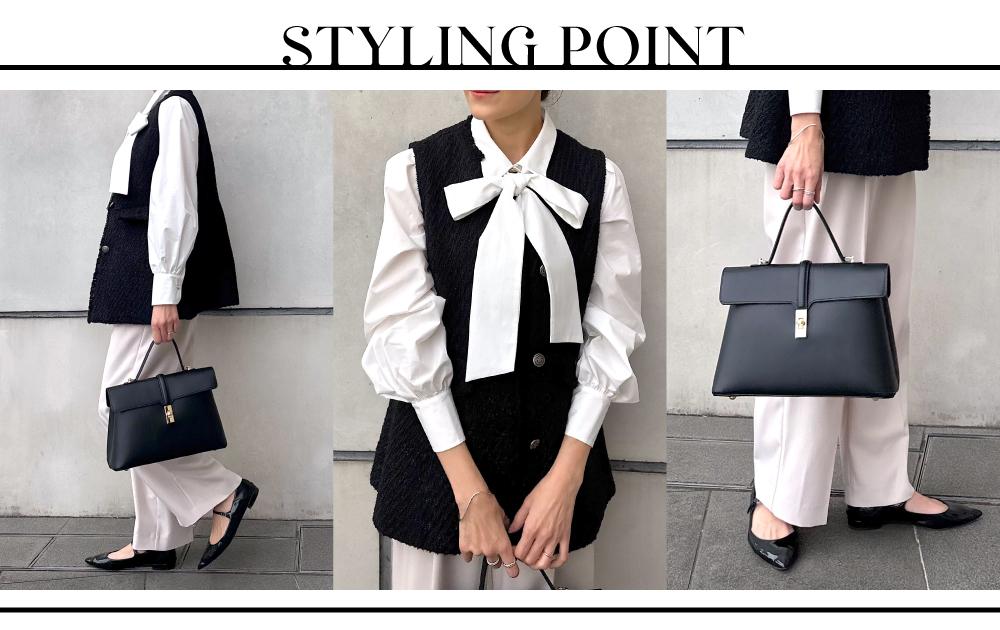 小物をブラックで合わせることでドッキングブラウスのリボンも甘さ控えめな大人印象に♪