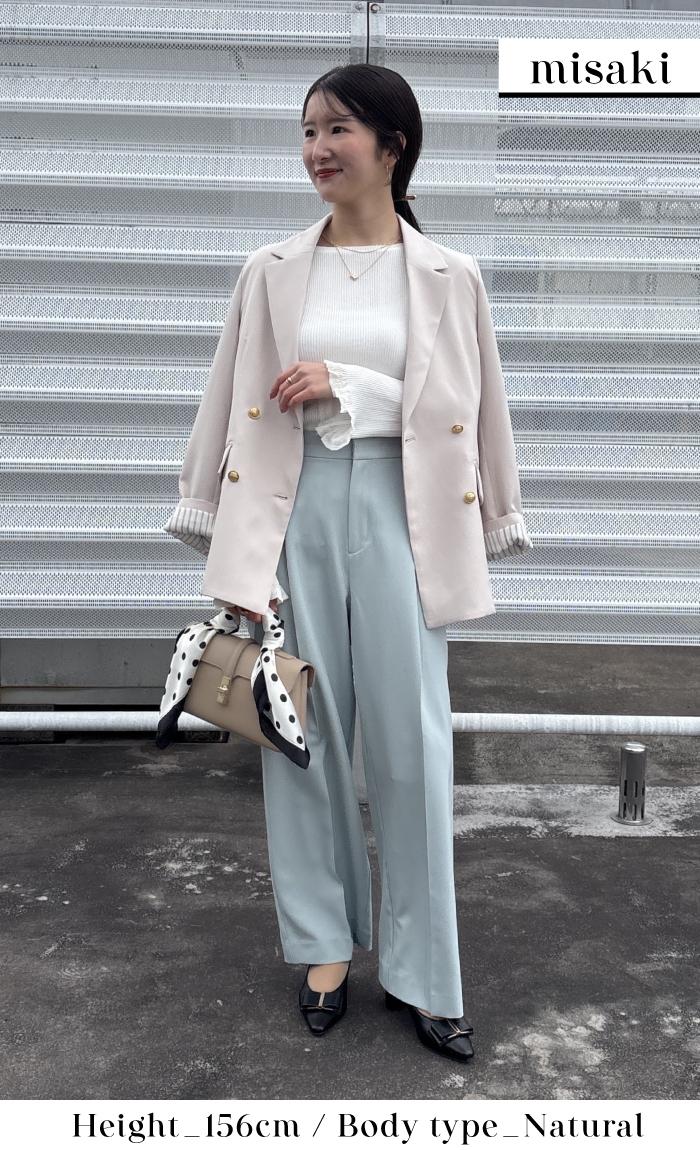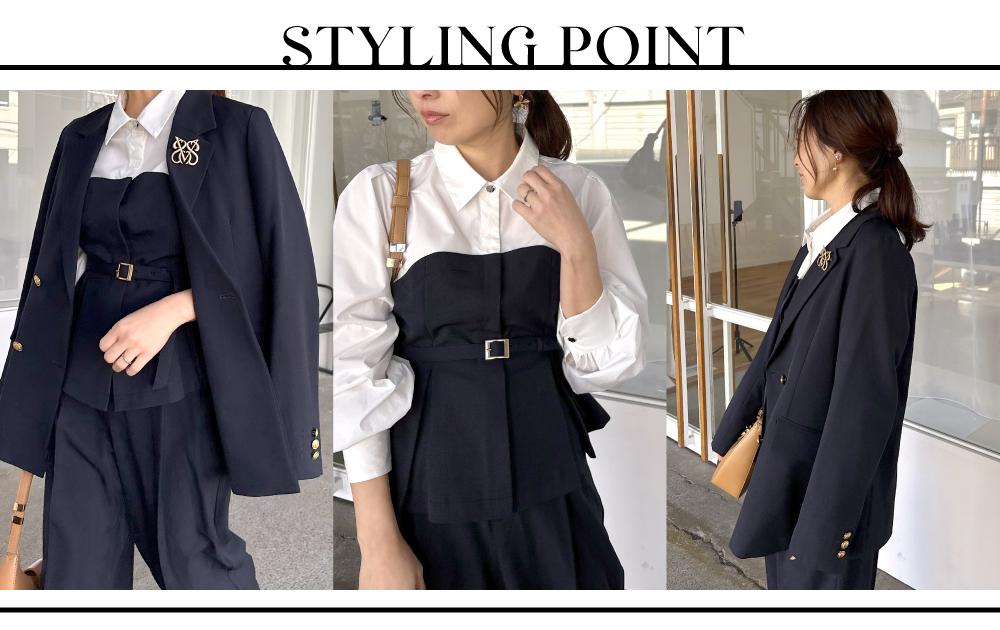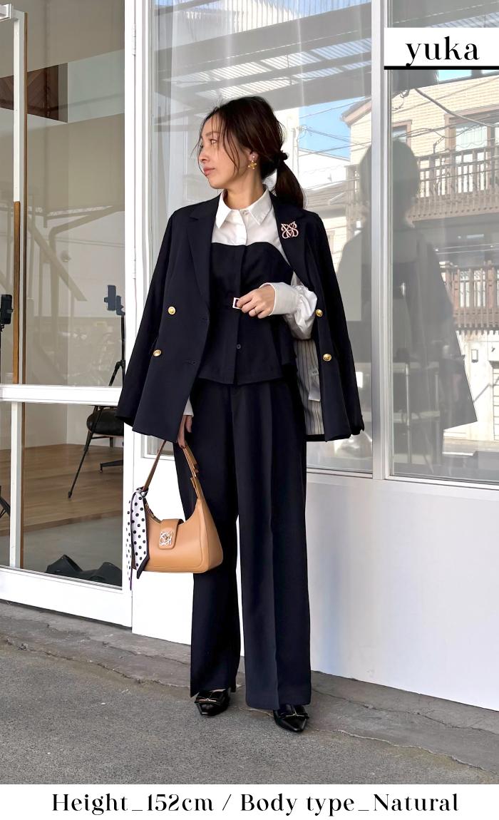 入園・卒園式、何着るか本当に悩む…そんなママにちょうどいい、きちんと見えセットアップ。ジャケット×ビスチェ×ワイドパンツで体のラインを拾いすぎず、写真映えも◎シャツの白で顔まわりが明るく見えるのも嬉しいポイント。