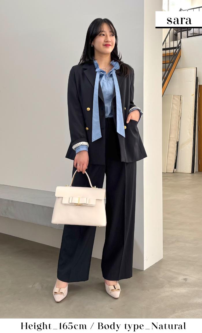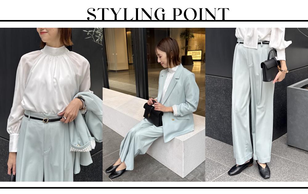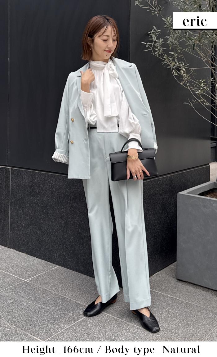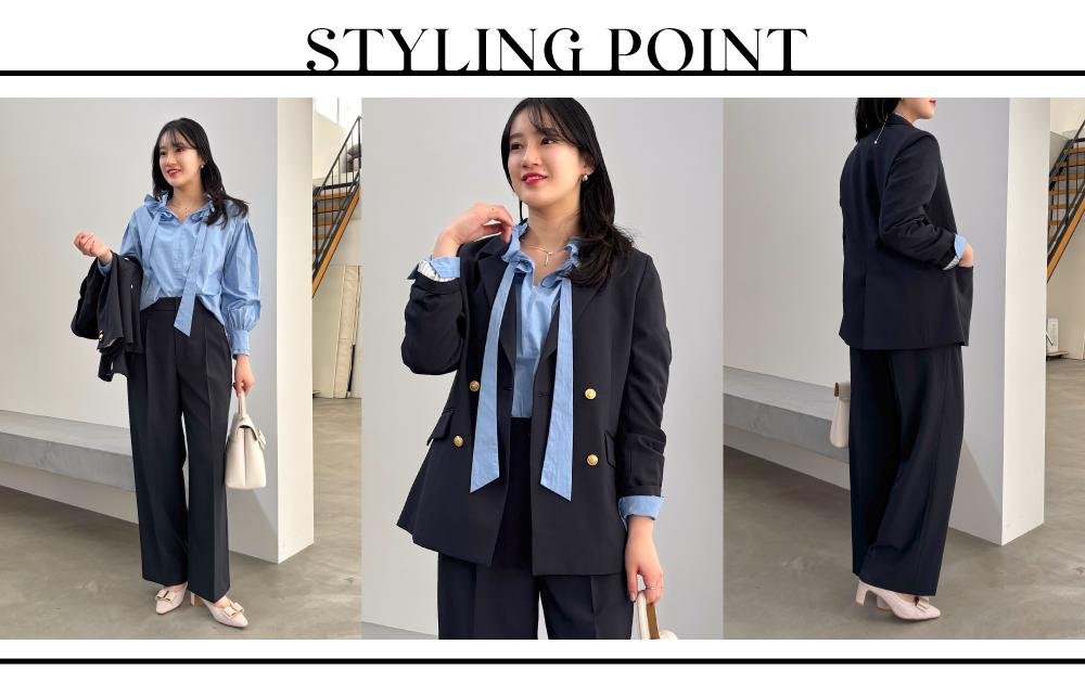 ネイビーのセットアップならフレッシュさも感じられさらにブラウスもブルー系に合わせることでより洗練された印象に♪