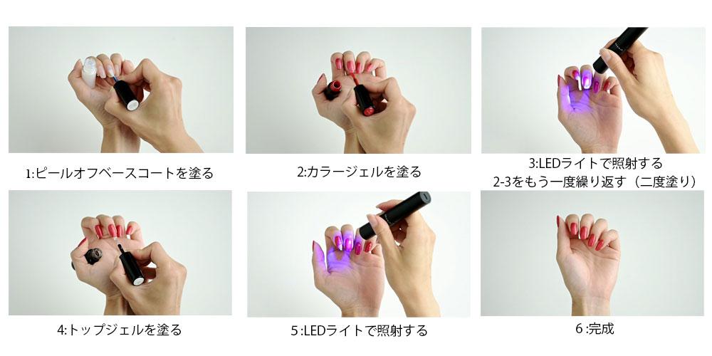 *ライトは1本ずつジェルを塗った後でも、5本まとめて塗った後でもどちらでも大丈夫です。 3:カラージェルを塗る