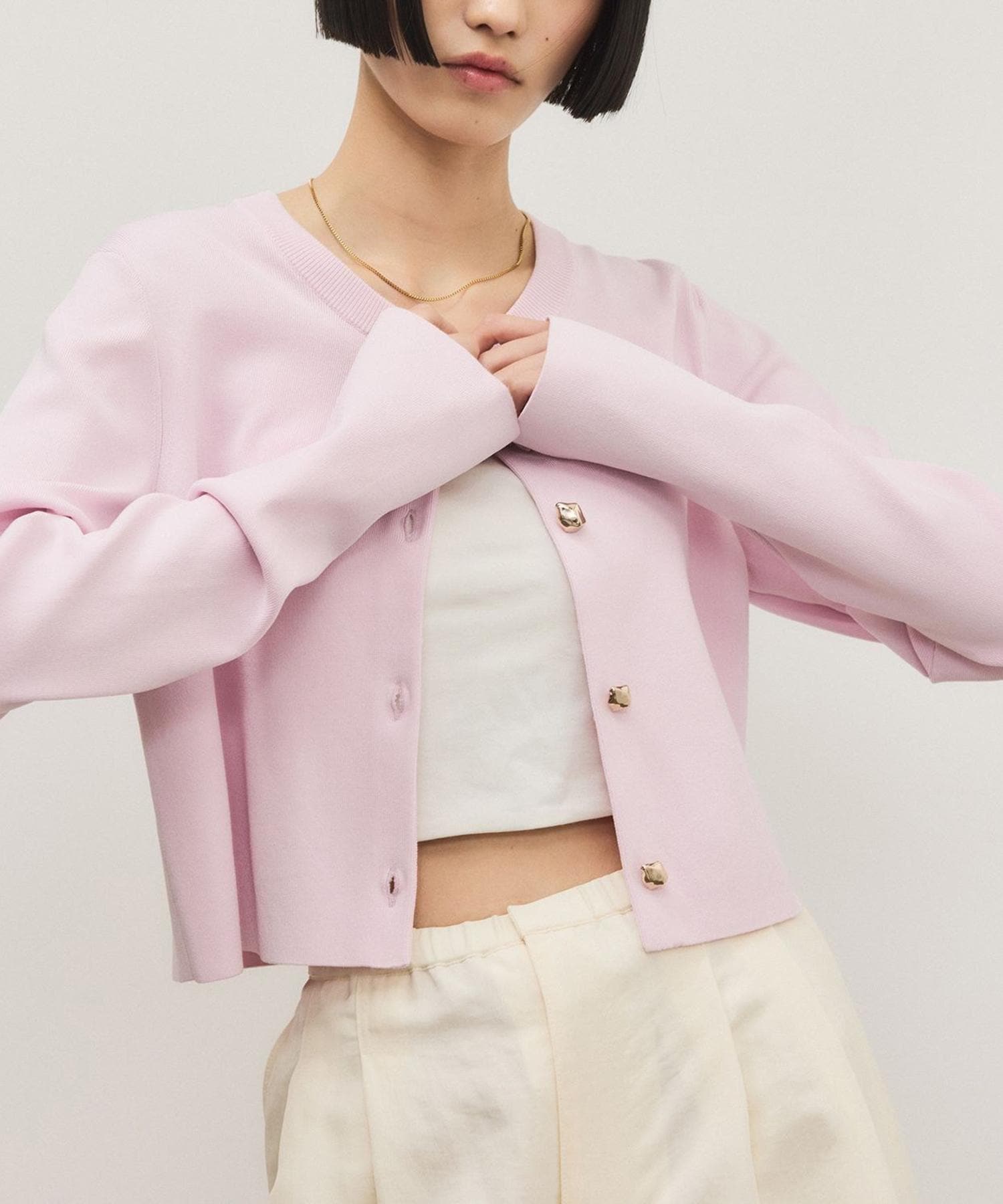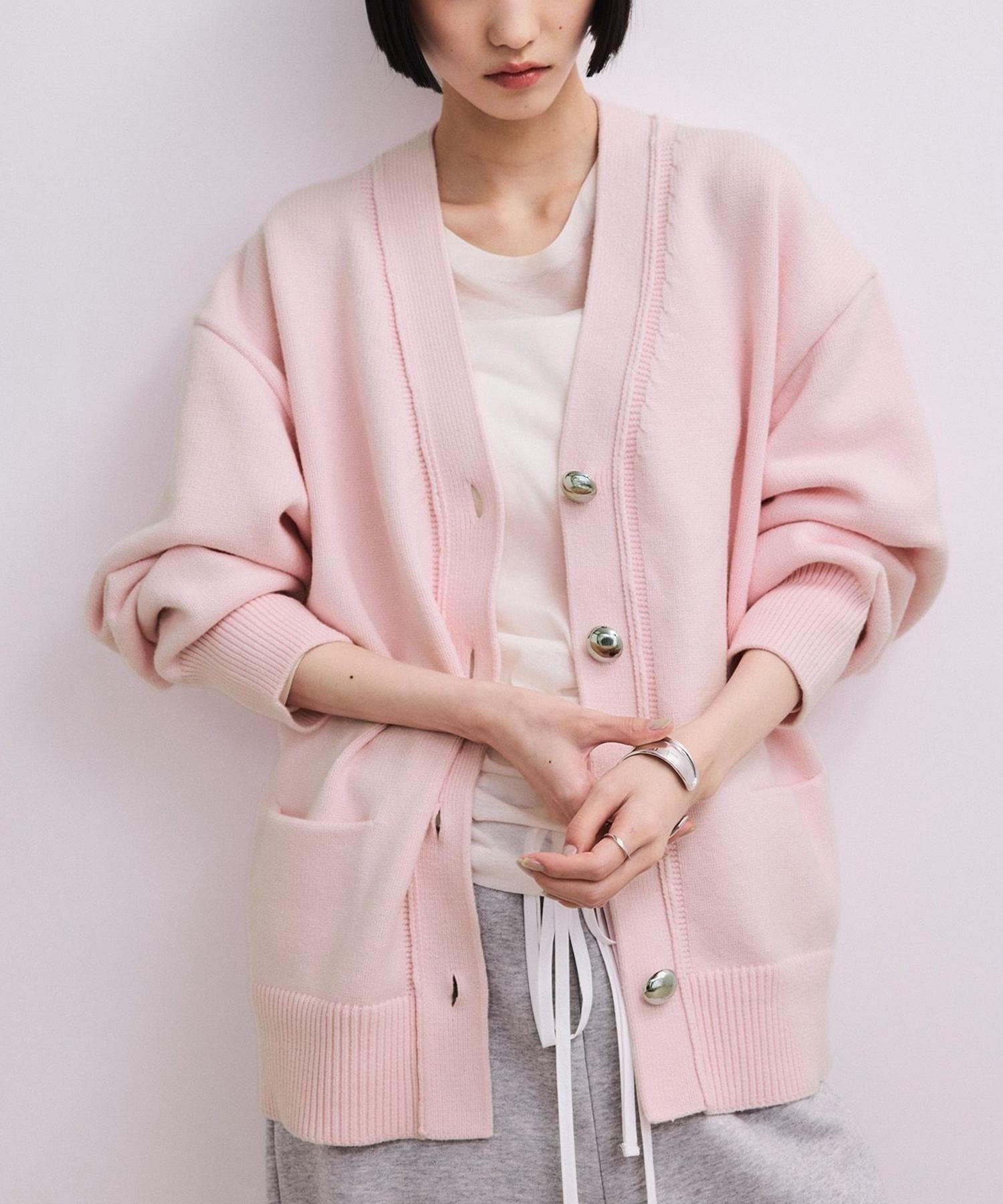 柔らかな女性らしいカラーが着映えること間違いなし。ゆったりとしたサイジングで体を優しく包み込み、メタルボタンがアクセントをプラスしてくれるVネックカーディガン