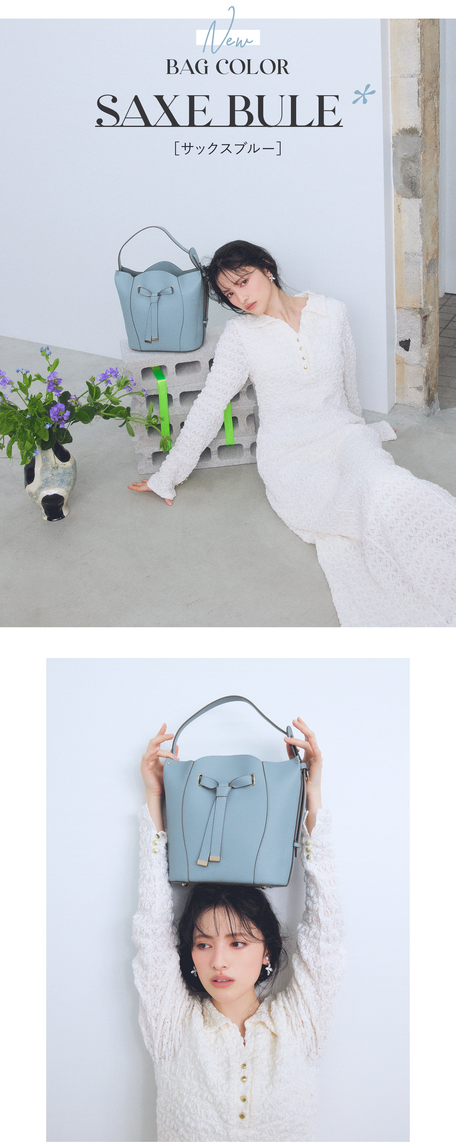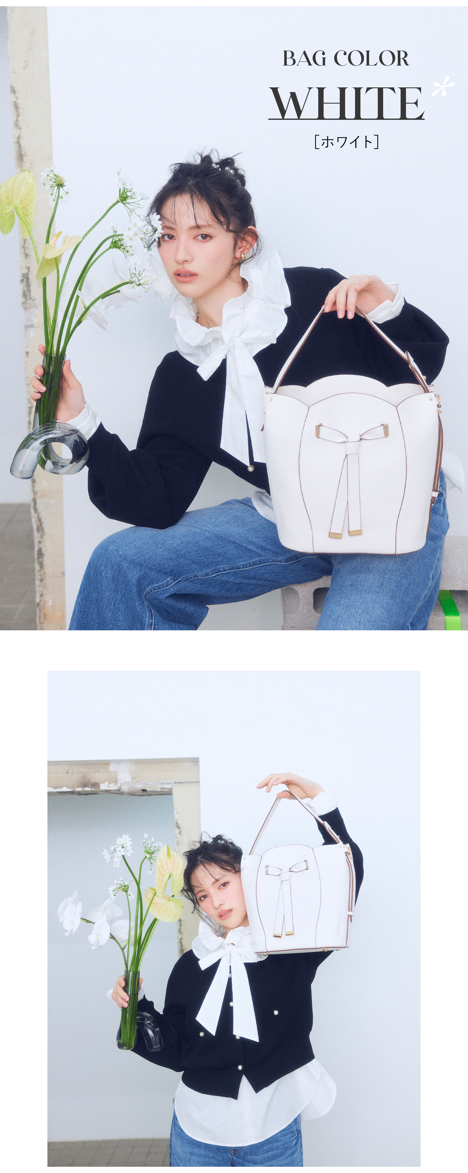 バッグのリボンデザインと相性抜群な大きめのフリルブラウスで、とことんコーデも華やかに。ベーシックなネイビーカーディガンと重ねることで、落ち着きあるレディな雰囲気。デニム合わせなら大人カジュアルに仕上がります。
