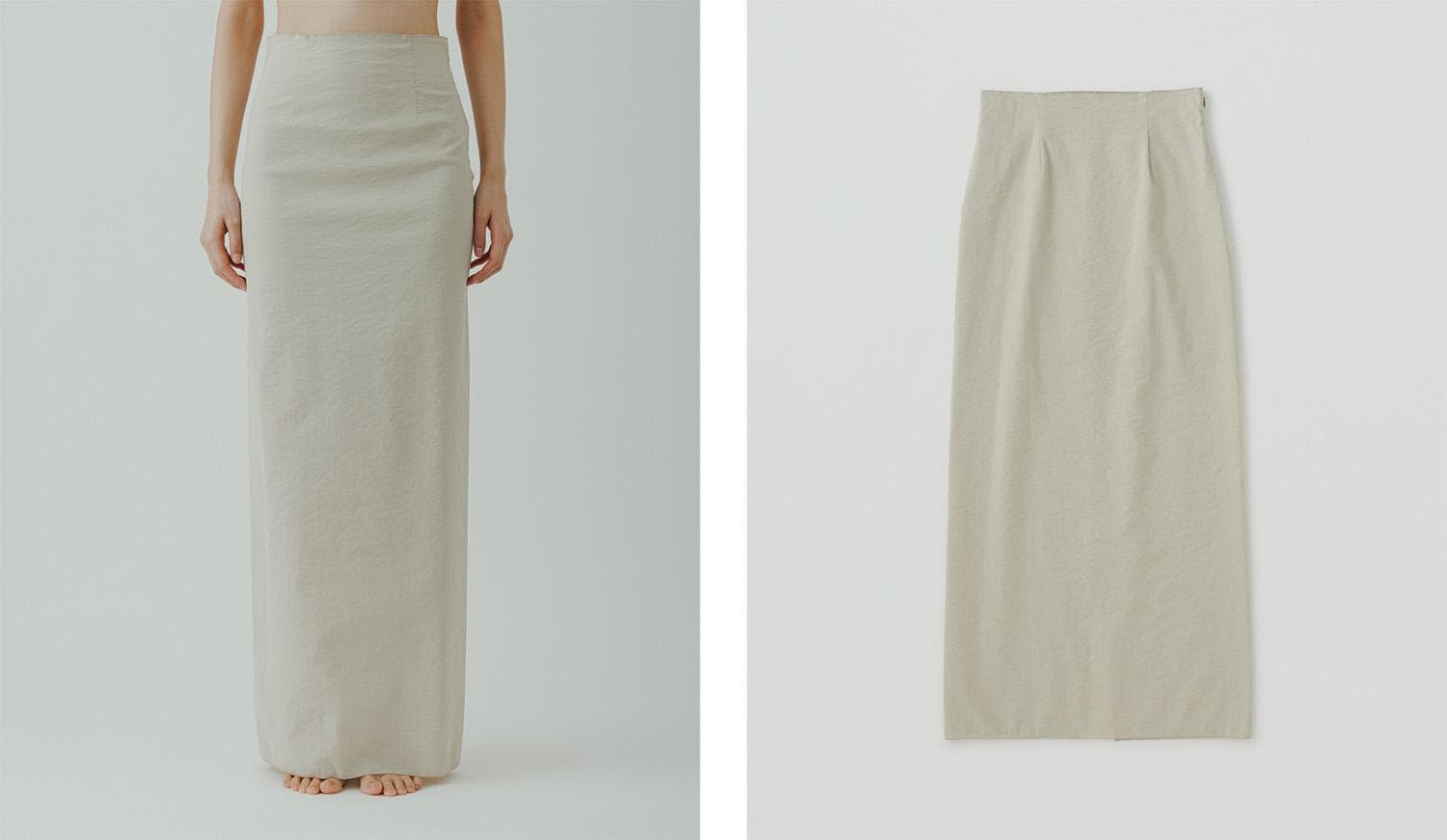ブランドローンチ時より好評のIラインスカートに、新色ベージュが登場。(※以前のベージュとは異なります)