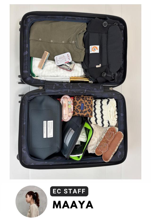 キャリーバッグの中身は、当日の朝まで使用しているヘアアイロンやベビーモニター、いざというときに安心の抱っこ紐や着替え1セットなど、かさばりはするけれど外せないアイテムばかりです。