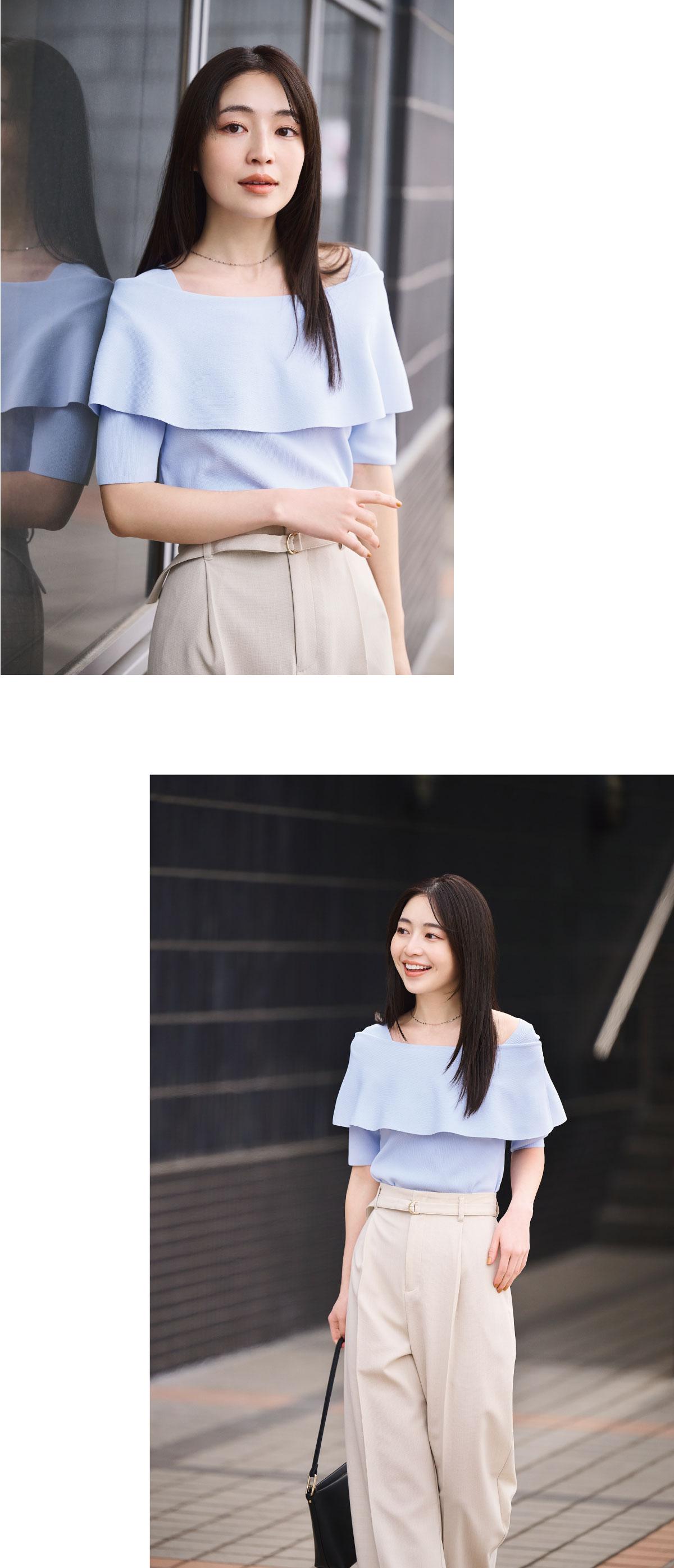 キレイ色のトップスを合わせて、