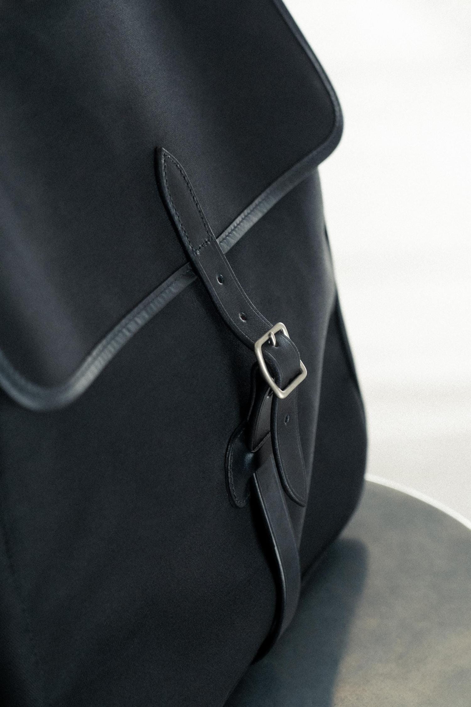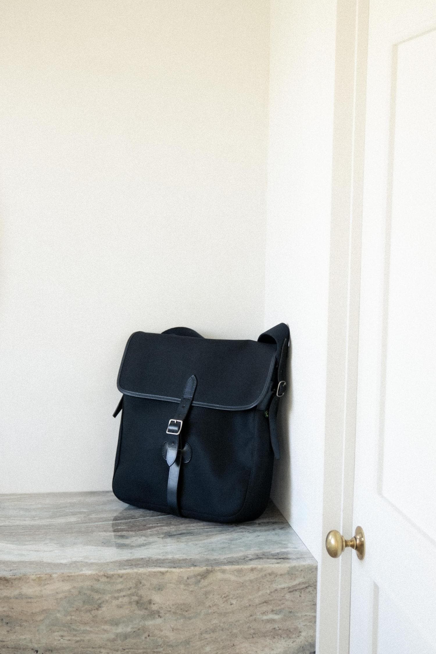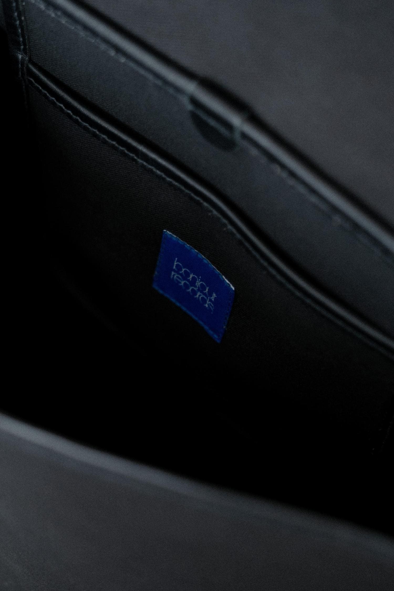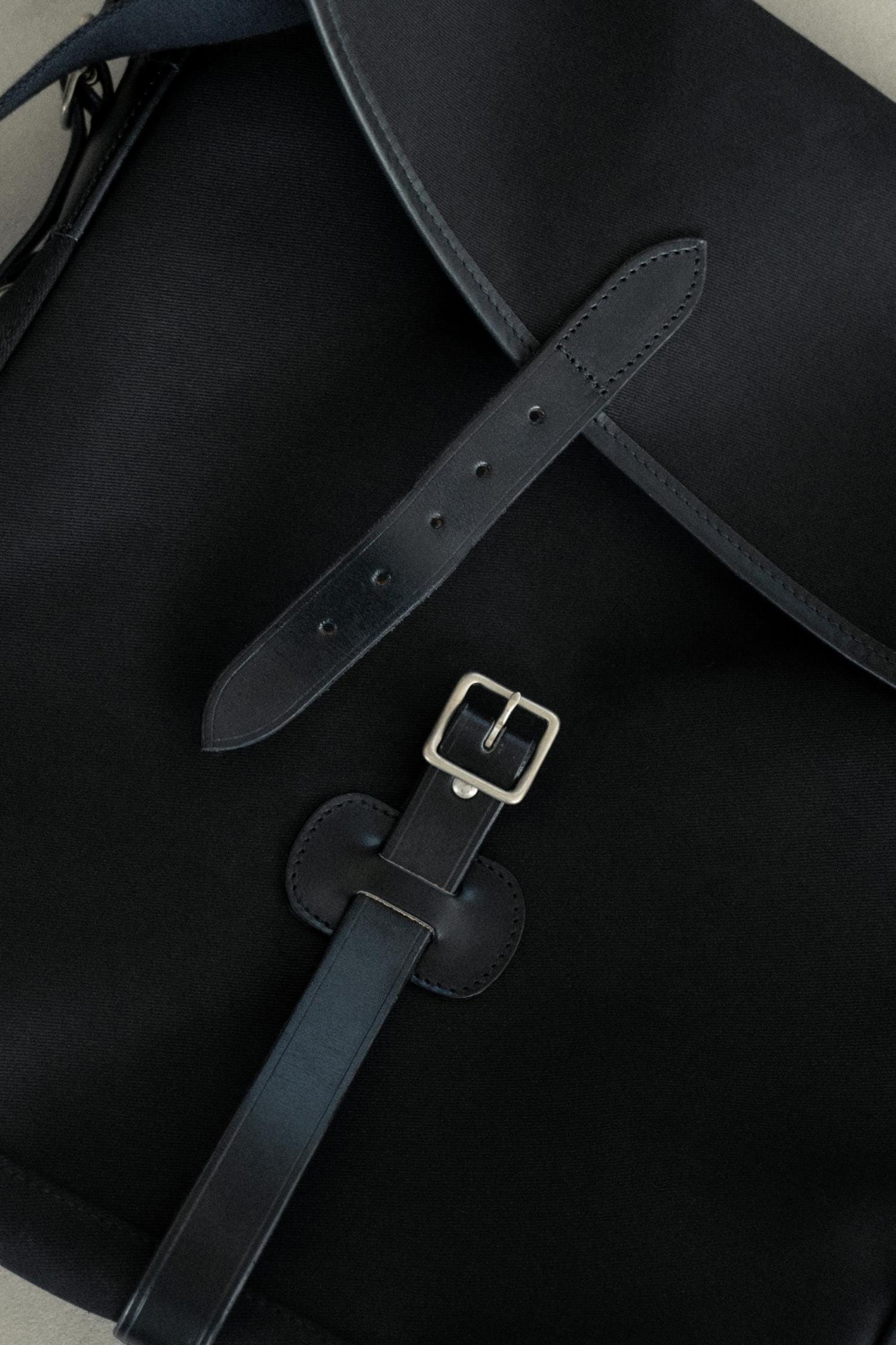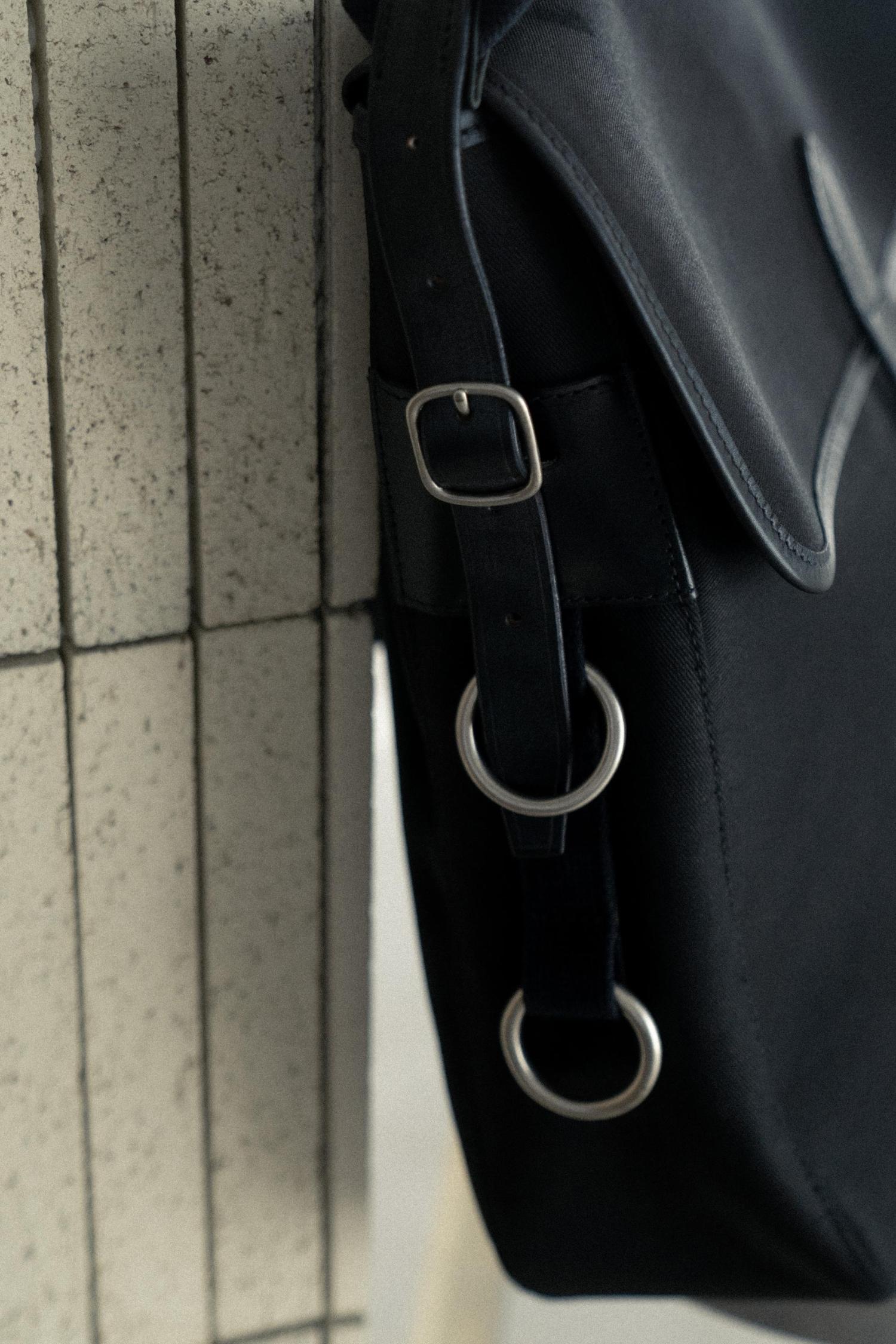 大容量のボックス型でたっぷりと収納ができ、重い荷物を入れても安定感がある幅広のストラップもポイント。上記をベースにフロントベルトをシンプルに太めの1本に変更し、また、バッグの入り口の雨よけをなくしレコードの出し入れをスムーズに、フロントのメッシュポケットも外し、よりシンプルに仕上げ、パーツも通常真鍮のゴールドのところ、艶なしのシルバー色に変更。