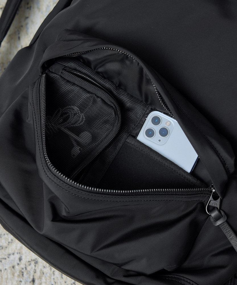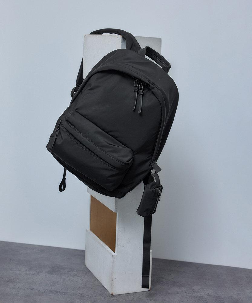 表地は撥水のセミマット素材。インナーポケットはメッシュ、PCポケットはネオプレンでクッション性と伸縮性を確保。
