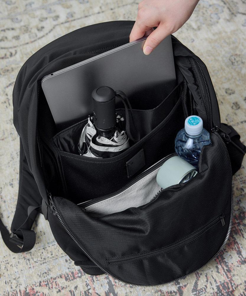 大容量でパソコン、折りたたみ傘、500㎖のペットボトルもすっぽり。
