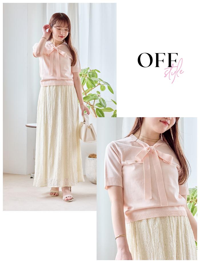 淡いピンクのボウタイニットに繊細なレーススカートを合わせ、春らしい柔らかさと上品さを両立させたスタイリングです。小物をホワイト系で統一することで、甘めな配色にクリーンな抜け感が加わり、洗練された大人の「オフスタイル」が完成します。