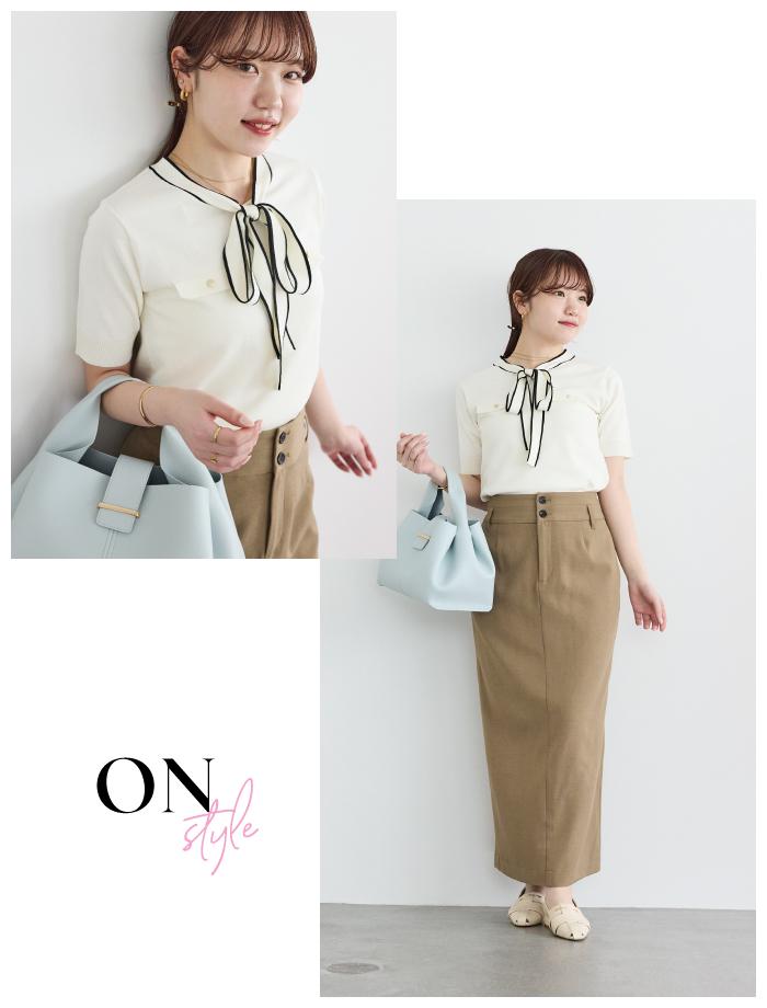 バイカラーの配色が目を惹くボウタイニットを主役に、タイトスカートを合わせてスマートにまとめた「オンスタイル」です。顔周りに華やかさを添えるリボンデザインが、落ち着いたブラウン系のボトムスとも相性抜群で、オフィスシーンでも品良く映える装いに仕上がります。